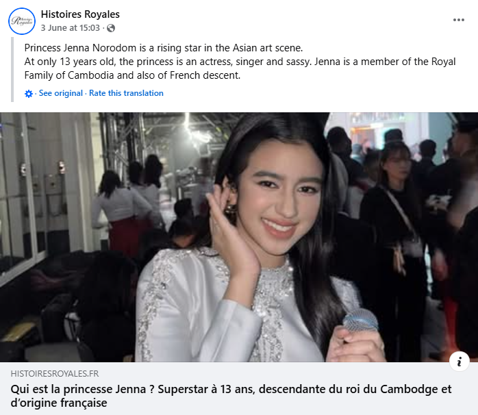 ក្នុងអត្ថបទប្រព័ន្ធផ្សព្វផ្សាយបារាំងមួយនេះក៏បានបន្តបរិយាយពី ព្រះនាង នរោត្តម ជេនណា ថែមទៀតថា ព្រះនាងខ្មែរដើមកំណើតបារាំងរូបនេះ បានប្រសូតនៅទីក្រុងប៉ារីស ថ្ងៃទី ១១ ខែមីនា ឆ្នាំ ២០១២។ ទ្រង់គឺជាបុត្រីរបស់ម្ចាស់ក្សត្រិយ៍ខ្មែរ និងអ្នកជំនួញជនជាតិបារាំង, ព្រះនាង ជេនណា ប្រសូតក្រោមផ្កាយសំណាង។ នៅព្រះជន្ម ៣ វស្សាគ្រួសាររបស់ព្រះនាង នរោត្តម ជេនណា បានត្រឡប់មករស់នៅប្រទេសកម្ពុជាវិញ។ ព្រះនាង ជេនណា មានទេពកោសល្យសិល្បៈ ហើយទទួលបានការអប់រំសកល ធ្វើឲ្យទ្រង់អាចនិយាយភាសាខ្មែរ បារាំង អង់គ្លេស ថៃ និងចិន។