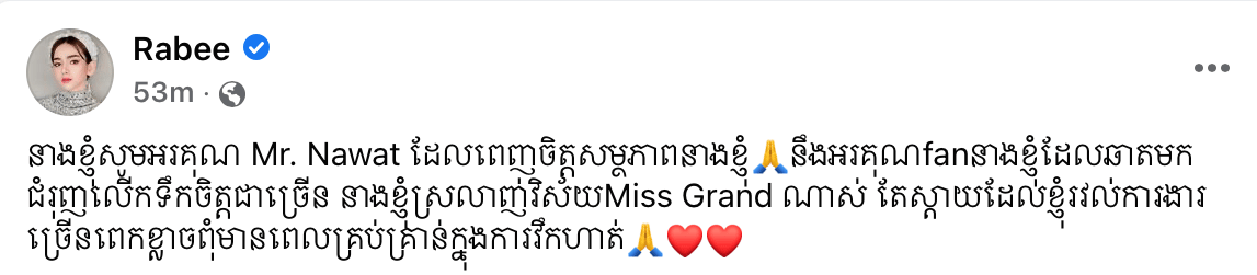 មិនសំងំយូរ តារាចម្រៀងចូលចិត្តស្ទីលតុបតែងខ្លួនប្លែកៗ រ៉ាប៊ី ក៏បានចេញមុខអរគុណ Mr. Nawat ដែលពេញចិត្តសមត្ថភាពរបស់នាង ហើយក៏អរគុណហ្វេនៗដែលបានឆាតទៅជំរុញលើកទឹកចិត្តជាច្រើន។ ភ្ជាប់ជាមួយពាក្យពេជន៍អរគុណ រ៉ាប៊ី ក៏បានលើកឡើងថា នាងស្រលាញ់កម្មវិធី Miss Grand ណាស់ តែស្ដាយដែលនាងរវល់ការងារច្រើនពេក ខ្លាចពុំមានពេលគ្រប់គ្រាន់ក្នុងការហ្វឹកហាត់។
