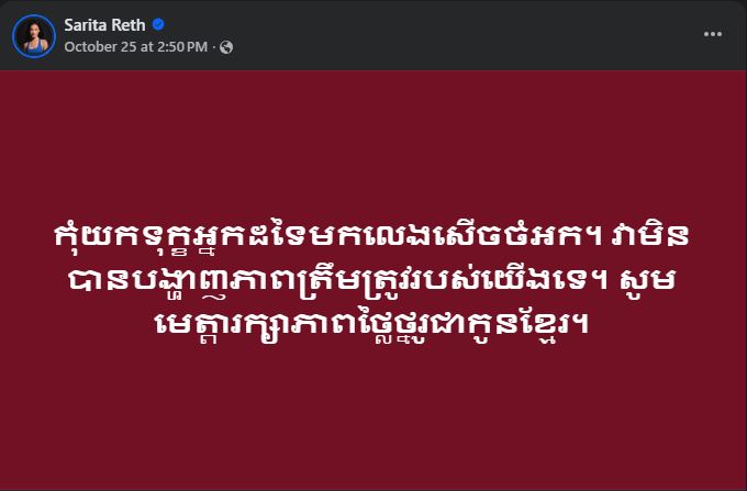 ជាមួយគ្នានេះ បវរកញ្ញា រ៉េត សារីតា បានបង្ហោះនៅលើហ្វេសបុកផ្លូវការរបស់កញ្ញាយ៉ាងដូច្នេះថា៖ «កុំយកទុក្ខអ្នកដទៃមកលេងសើចចំអក។ វាមិនបានបង្ហាញភាពត្រឹមត្រូវរបស់យើងទេ។ សូមមេត្តារក្សាភាពថ្លៃថ្នូរជាកូនខ្មែរ»។ ក្នុងនោះដែរ មហាជនអ្នកប្រើប្រាស់បណ្ដាញសង្គមក៏បានចូលខមិនបញ្ចេញមតិផ្ទាល់ខ្លួនរបស់ពួកគេ ដោយមតិខ្លះបានបង្ហាញការគាំទ្រចំពោះការលើកឡើងរបស់កញ្ញា រីឯមតិខ្លះទៀតបានបង្ហាញការមិនពេញចិត្តចំពោះការលើកឡើងរបស់បវរកញ្ញារូបនេះផងដែរ។