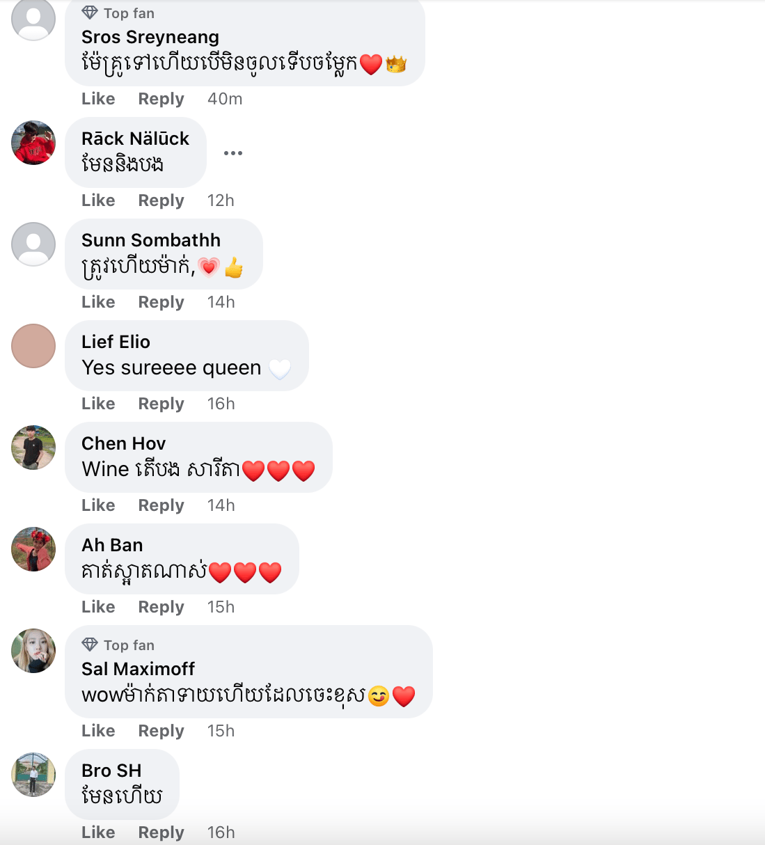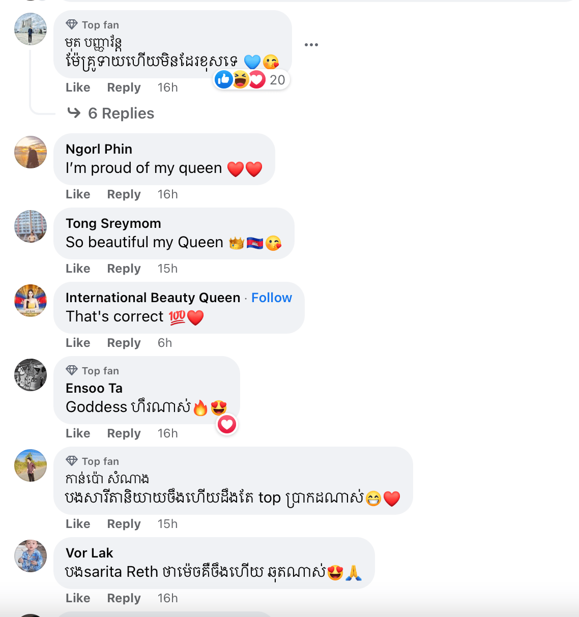 ក្នុងចំណោម បវរកញ្ញា-បុរសឯកកម្ពុជា គេឃើញ Miss Universe Cambodia 2020 កញ្ញា រ៉េត សារីតា ក៏បាន share រូបថតទាំងនោះ ដោយភ្ជាប់ប្រយោគមួយឃ្លាថា «បើមិនចូលថប់ទេមានតែចម្លែក» ដែលពាក្យពេចន៍ដ៏មានអត្ថន័យមួយឃ្លានេះ បង្ហាញពីជំនឿចិត្តយ៉ាងមុតមាំដែលរៀមច្បងមានចំពោះប្អូនស្រី ធ្វើឱ្យអ្នកគាំទ្ររំជើបរំជួលជាខ្លាំង រហូតហ្វេនខ្លះ Comment ហៅ សារីតា ថា ម៉ែគ្រូ ថែមទៀតផង។ មិនតែប៉ុណ្ណោះ គ្រប់គ្នាថែមទាំងមានគំនិតសុទិដ្ឋិនិយម និងការយល់ឃើញដូច MUC 2020 រូបនេះថែមទៀតផង ដោយជឿជាក់ថា ហង្ស ម៉ានីតា នឹងអាចចូលដល់វគ្គ Top ចុងក្រោយក្នុងការប្រកួត Miss Universe លើកទី៧១នេះ។
