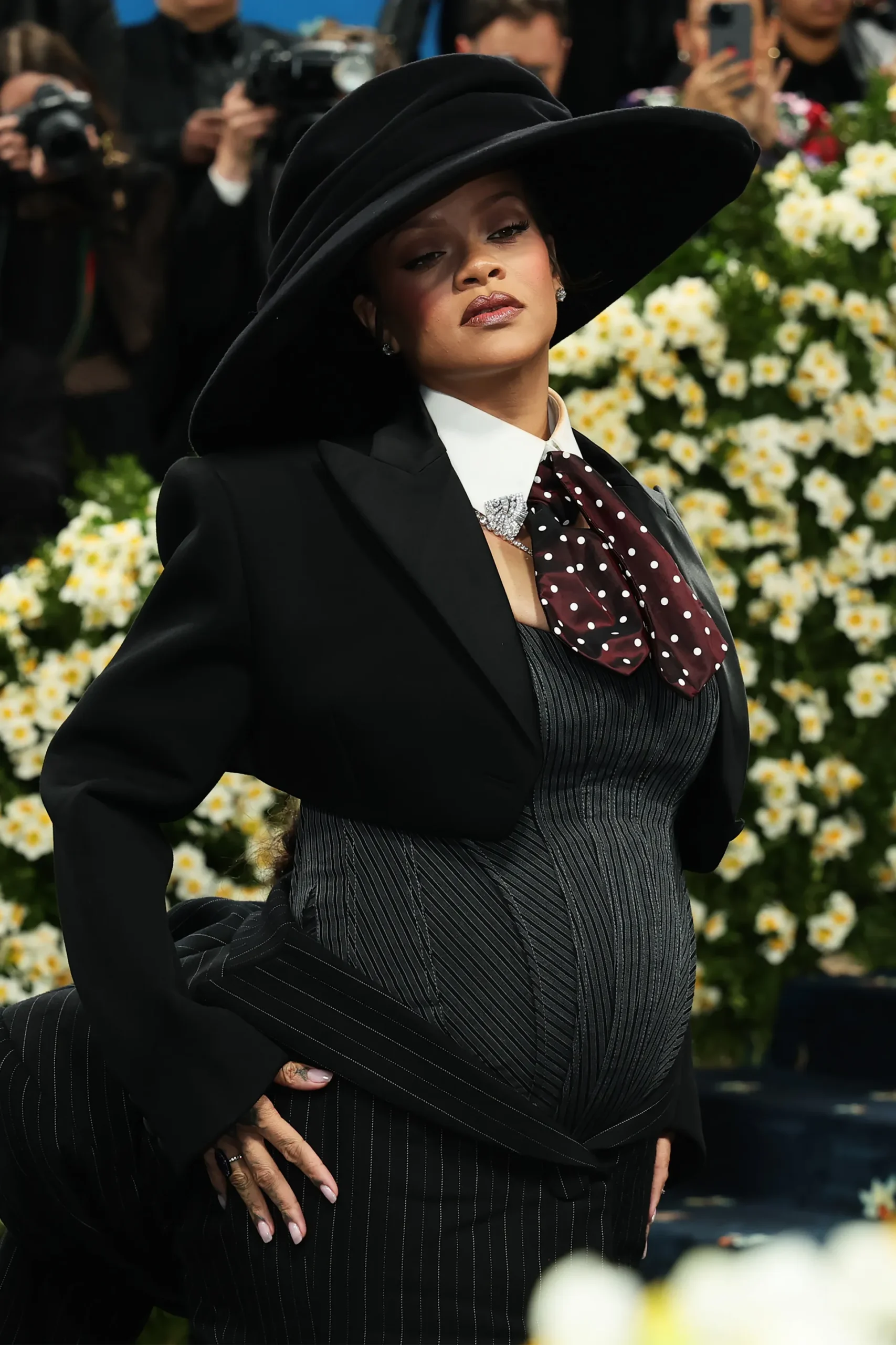 នៅលើកម្រាលព្រំ Met Gala តារាប្រុស A$AP Rocky បានបញ្ជាក់ព័ត៌មាននេះទៅកាន់ Reuters ដោយនិយាយថា “វាពិតជាមានអារម្មណ៍ថាអស្ចារ្យ” ដើម្បីបង្ហាញពីការមានផ្ទៃពោះរបស់ Rihanna ដែលធ្វើឱ្យអ្នកសារព័ត៌មានមានចម្ងល់ និងចាប់ផ្ដើមទាក់ទងទៅកាន់តំណាងរបស់តារាស្រីរូបនេះតែម្ដង។ ក្រោយមកនាងក៏បានបង្ហាញខ្លួនក្នុងឈុតសម្លៀកបំពាក់ស្ទីលឆ្នាំ ១៩២០ ម៉ាក Marc Jacobs ជាមួយក្រឡាឆ្នូតៗដោយរំលេចពីផ្ទៃពោះរបស់នាងយ៉ាងច្បាស់អមដោយការតុបតែងជាមួយមួកធំ សមស្របនឹងប្រធានបទ Met Gala 2025 “Superfine: Tailoring Black Style”។