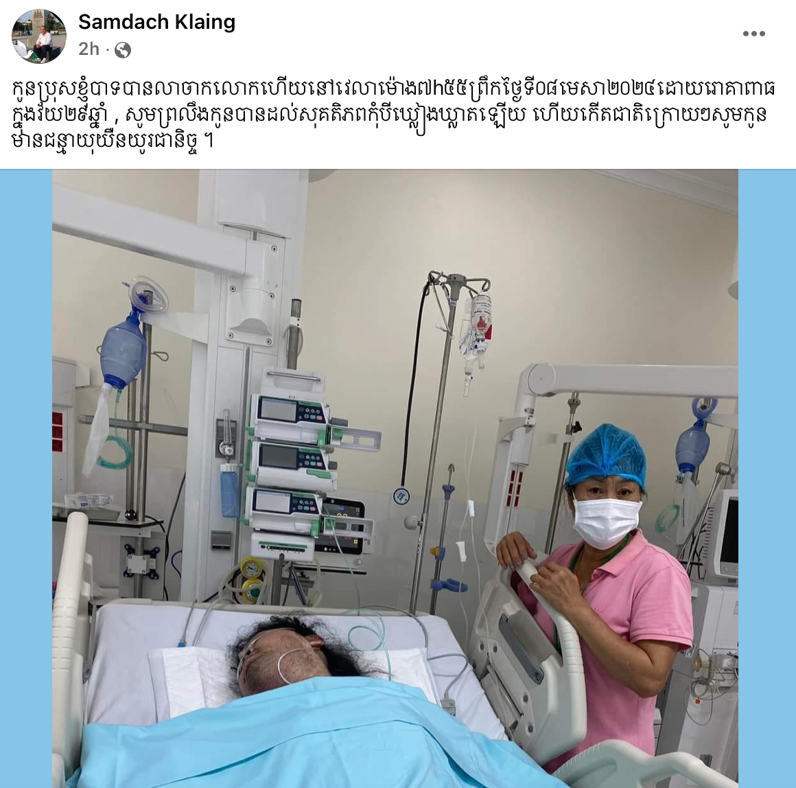 គណនីហ្វេសប៊ុកឈ្មោះ Samdach Klaing បានបង្ហោះរៀបរាប់យ៉ាងក្តុកក្តួលថា«កូនប្រុសខ្ញុំបាទបានលាចាកលោកហើយនៅវេលាម៉ោង៧h៥៥ព្រឹកថ្ងៃទី០៨មេសា២០២៤ដោយរោគាពាធក្នុងវ័យ២៩ឆ្នាំ , សូមព្រលឹងកូនបានដល់សុគតិភពកុំបីឃ្លៀងឃ្លាតឡើយ ហើយកើតជាតិក្រោយៗសូមកូនមានជន្មាយុយឺនយូរជានិច្ច»។