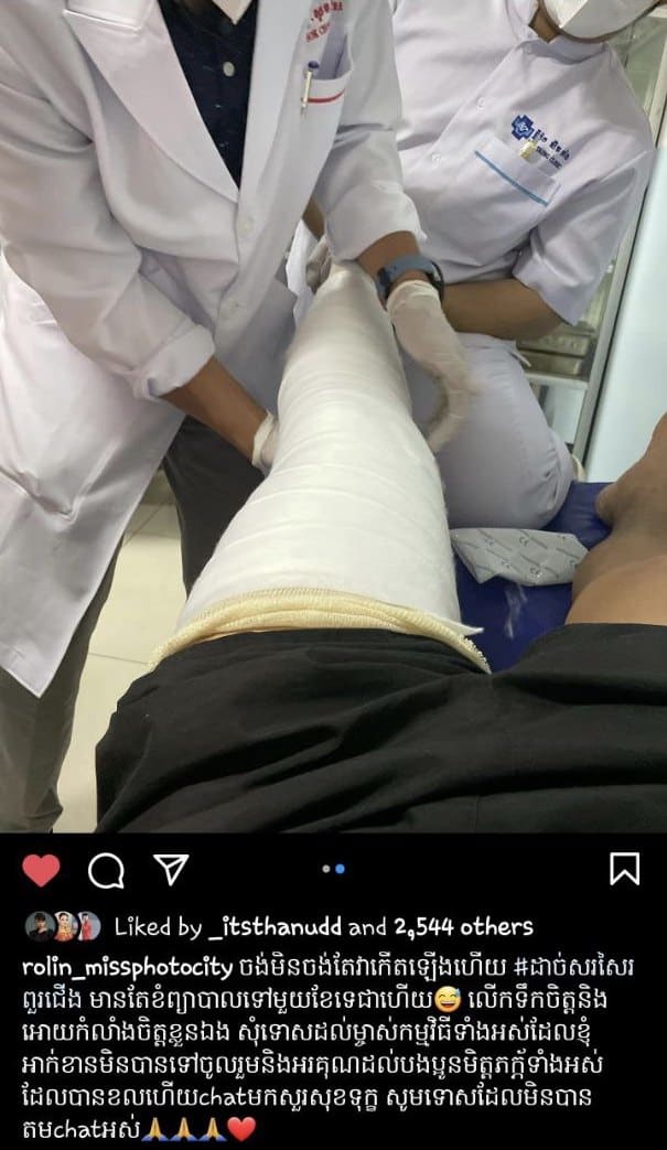រ៉ូលីន រៀបរាប់ថា៖ «ចង់មិនចង់តែវាកើតឡើងហើយ #ដាច់សរសៃរពួរជើង មានតែខំព្យាបាលទៅមួយខែទេជាហើយ លើកទឹកចិត្តនិងអោយកំលាំងចិត្តខ្លួនឯង សុំទោសដល់ម្ចាស់កម្មវិធីទាំងអស់ដែលខ្ញុំអាក់ខានមិនបានទៅចូលរួមនិងអរគុណដល់បងប្អូនមិត្តភក្ត័ទាំងអស់ដែលបានខលហើយchatមកសួរសុខទុក្ខ សូមទោសដែលមិនបានតមchatអស់»។