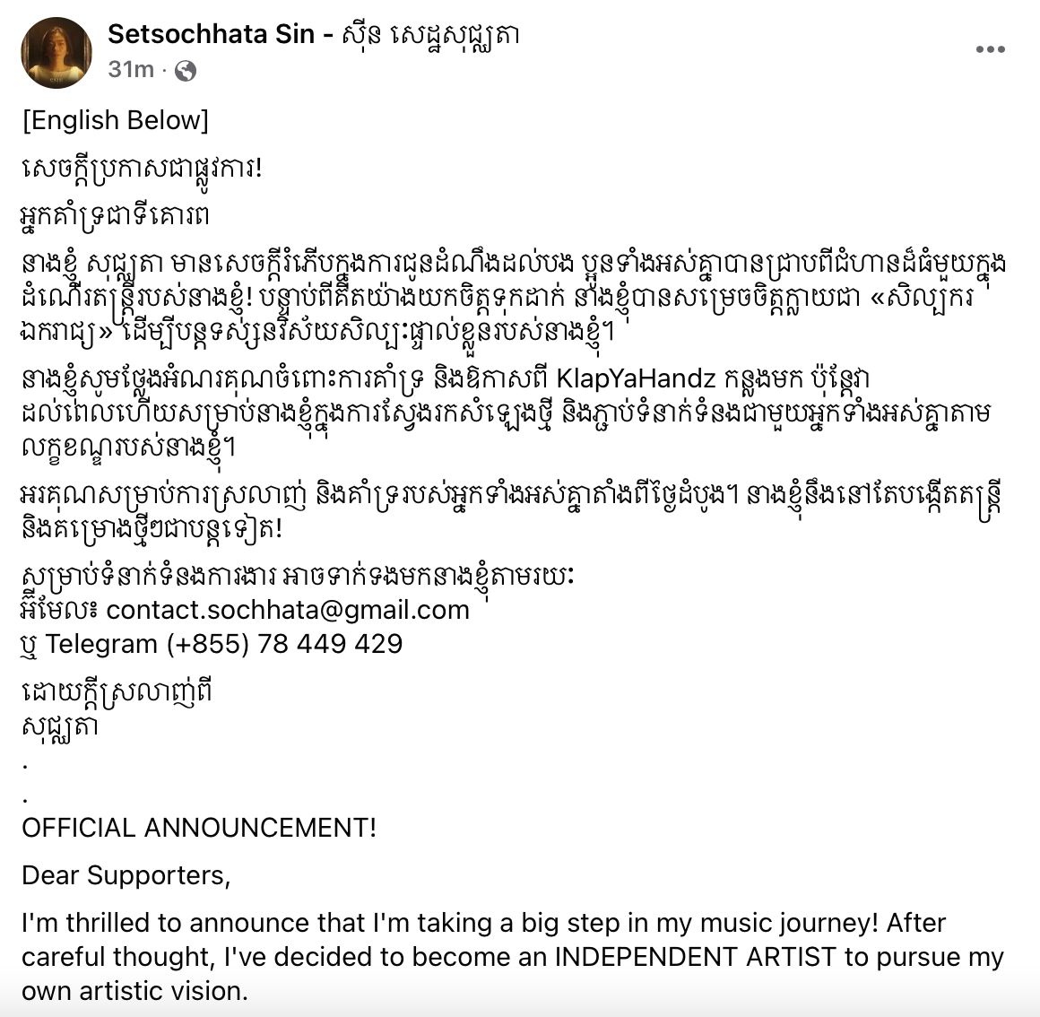 រយៈពេលប្រមាណជាង ៣ឆ្នាំនៃការជ្រកកោនក្រោមផលិតកម្ម KlapYaHandz របស់លោកចាងហ្វាង សុខ វិសាល ពេលនេះ ស៊ីន សេដ្ឋសុជ្ឈតា ដែលគ្រប់គ្នាស្គាល់ច្បាស់ថាជាចៅស្រីរបស់អធិរាជសំឡេងមាស ស៊ីន ស៊ីសាមុត បានប្រកាសខ្លួនជា «សិល្បករឯករាជ្យ» វិញហើយ ដើម្បីបន្តទស្សនវិស័យសិល្បៈផ្ទាល់ខ្លួនរបស់នាង។ នេះបើយោងតាមការបង្ហោះរបស់ទំព័រហ្វេសប៊ុក Setsochhata Sin – ស៊ីន សេដ្ឋសុជ្ឈតា នៅរសៀលថ្ងៃទី២៩ ខែឧសភា ឆ្នាំ២០២៤។