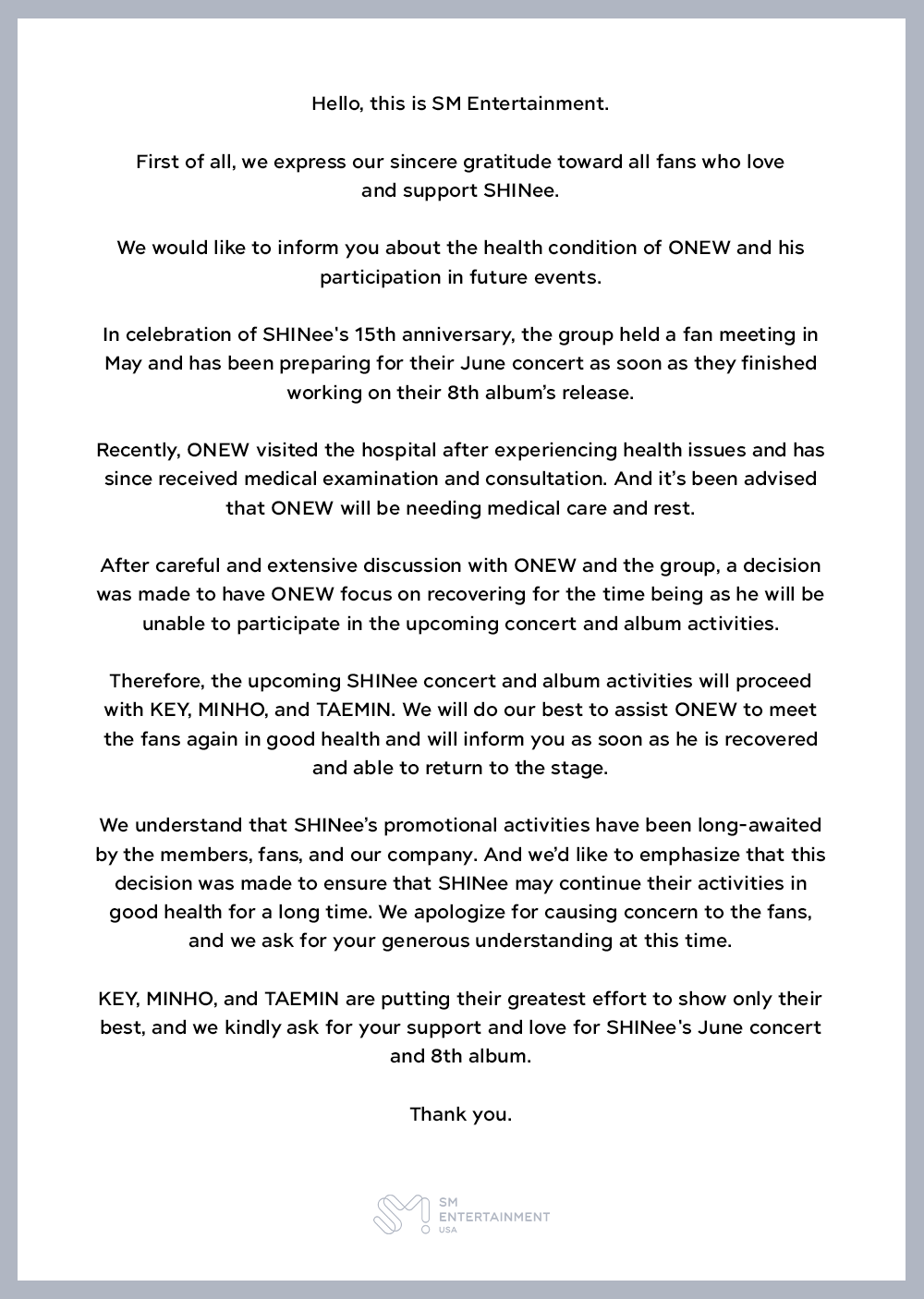 មិនបានប៉ុន្មាន ផលិតកម្ម SM ក៏បានចេញប្រកាសថា Onew កំពុងមានបញ្ហាសុខភាព និងផ្អាកការងារជាបណ្ដោះអាសន្នមួយរយៈសិនដើម្បីមើលថែទាំសុខភាពរបស់ខ្លួន។ Onew មានបញ្ហាសុខភាព និងត្រូវបានក្រុមគ្រូពេទ្យស្នើសុំឱ្យសម្រាកមើលទាំសុខភាព។