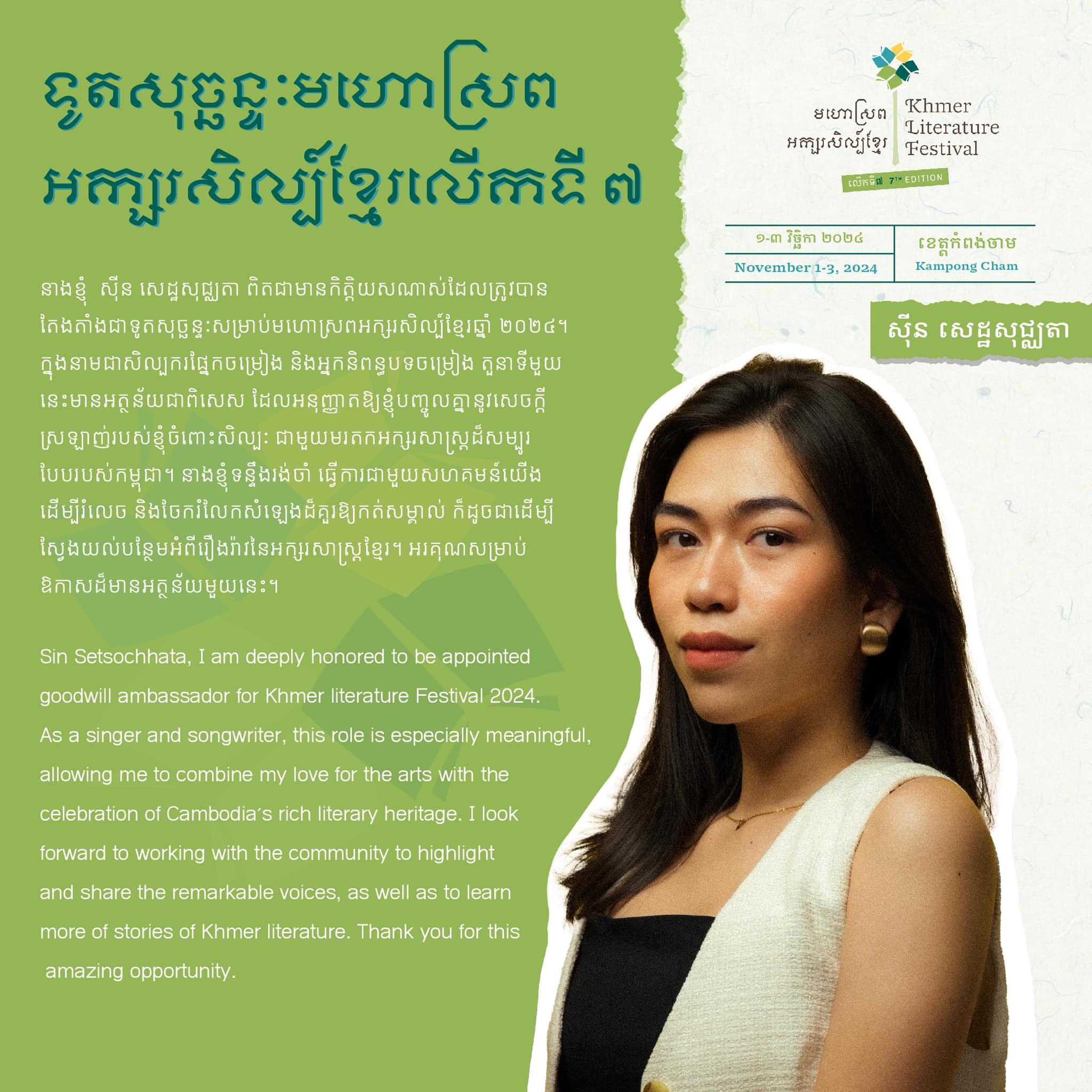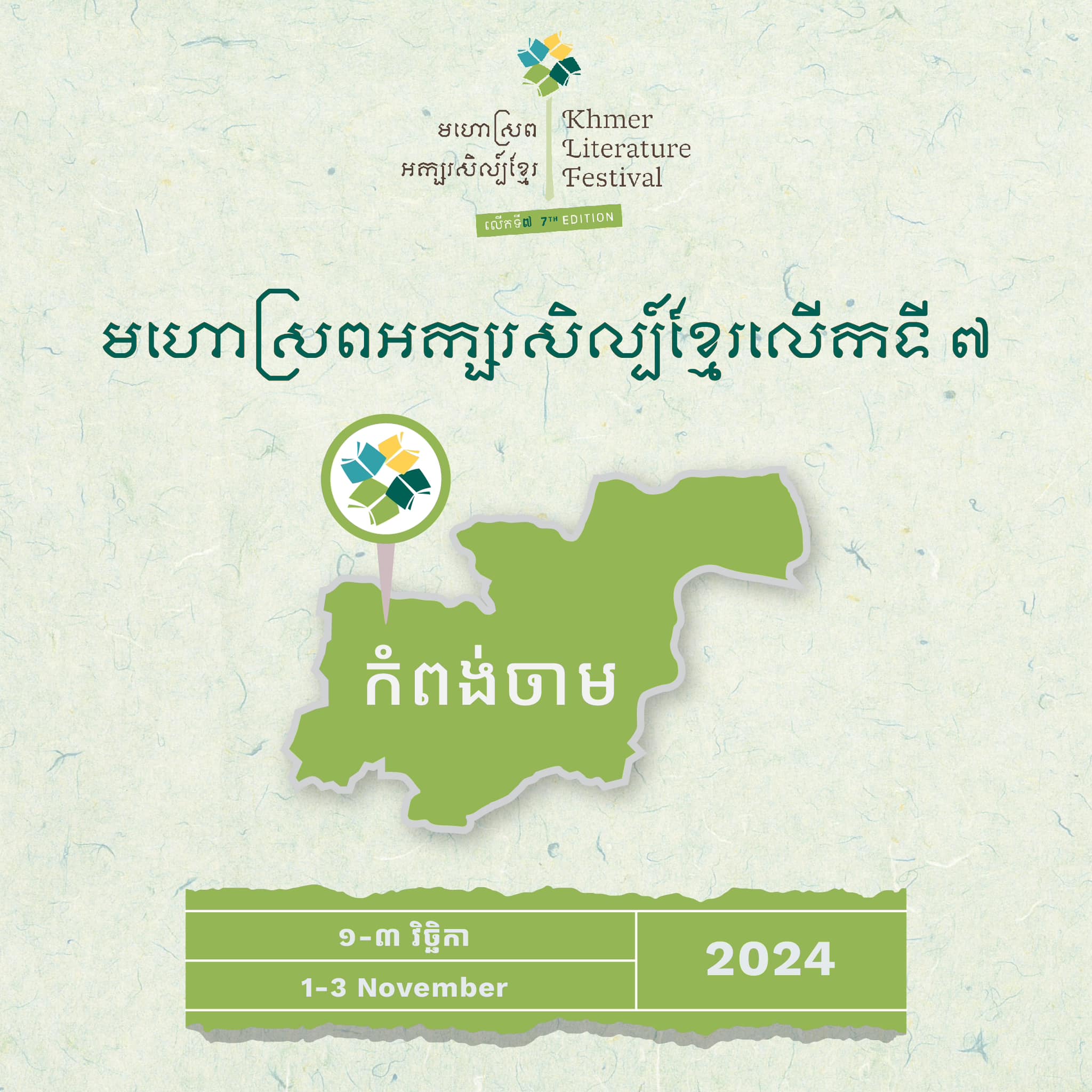 គួរ​បញ្ជាក់​ឱ្យ​ដឹង​ដែរ​ថា ​មហោស្រព​​អក្សរសិល្ប៍​ខ្មែរ​ លើក​ទី​៧​ នេះ​​នឹង​ប្រព្រឹត្តិ​ធ្វើ​ឡើង​ចាប់​ពី​ថ្ងៃ​ទី​​០១​ ដល់​ថ្ងៃ​ទី​០៣ ​ខែ​វិច្ឆិកា ឆ្នាំ ២០២៤ ​ក្រោម​ប្រធាន​បទ ​​«អក្សរសិល្ប៍​បៃតង​» អមជាមួយផ្ទាំងទស្សនីយភាពសិល្បៈកម្សាន្តផ្សេងៗ និង ការប្រកួតប្រជែងលើផ្នែកអក្សរសិល្ប៍ផងដែរ៕
