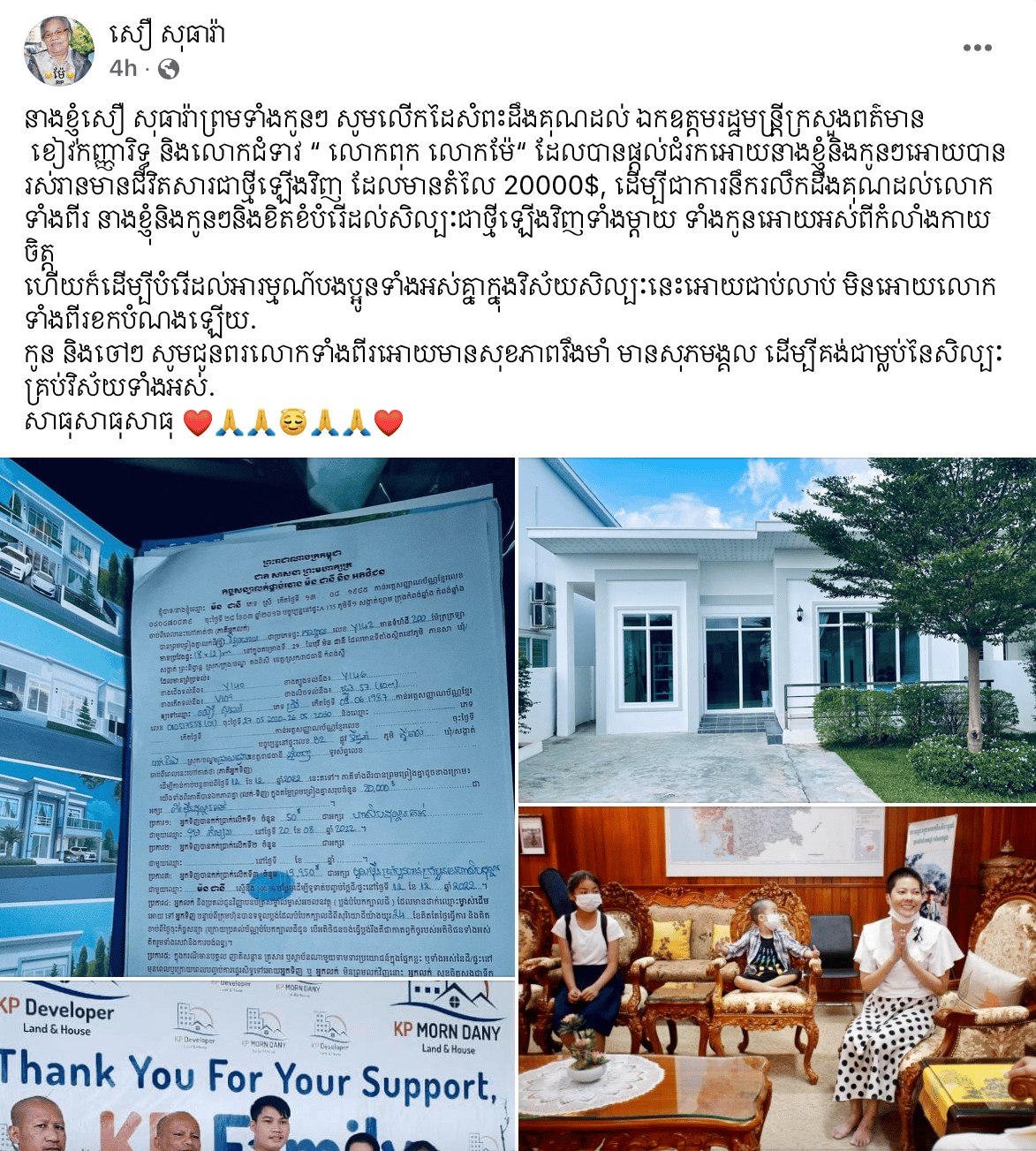 បន្ទាប់ពីទទួលបានអំណោយផ្ទះមួយខ្នងតម្លៃ២ ម៉ឺនដុល្លារ អតីតភរិយា សាពូន មីដាដា បានបង្ហោះសារថ្លែងអំណរគុណយ៉ាងជ្រាលជ្រៅដល់ ឯកឧត្តម ខៀវ កាញារីទ្ធ រដ្ឋមន្ត្រីក្រសួងព័ត៌មាន និងលោកជំទាវ ថែមទៀតសន្យាថា នាង និងកូនៗនឹងខិតខំបម្រើសិល្បៈជាថ្មីឱ្យអស់ពីកំលាំងកាយចិត្ត ដើម្បីជាការនឹករលឹកដឹងគុណដល់លោកទាំងពីរ៕