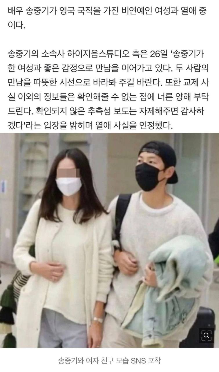 កាលពីព្រឹកមិញថ្ងៃទី ២៦ ខែ ធ្នូ ឆ្នាំ​ ២០២២ ផលិតកម្ម HighZium ដែលជាទ្រនំរបស់តារាប្រុស Song Joongki បានប្រកាសជាផ្លូវការថា៖ ពេលនេះរូបលោកកំពុងមានទំនាក់ទំនងស្នេហាជាមួយតារានារីក្រៅសិល្បៈម្នាក់ ខណៈរូបនាងជាជនជាតិបរទេស។