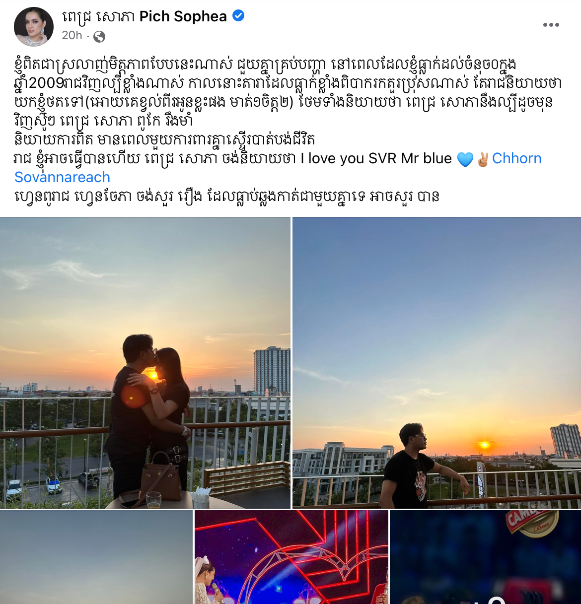 ភ្ជាប់ជាមួយរូបថតជាច្រើនសន្លឹក ពេជ្រ សោភា រៀបរាប់ថា «ខ្ញុំពិតជាស្រលាញ់មិត្តភាពបែបនេះណាស់ ជួយគ្នាគ្រប់បញ្ហា នៅពេលដែលខ្ញុំធ្លាក់ដល់ចំនុច០ក្នុងឆ្នាំ2009រាជវិញល្បីខ្លាំងណាស់ កាលនោះតារាដែលធ្លាក់ខ្លាំងពិបាករកតួរប្រុសណាស់ តែរាជនិយាយថាយកខ្ញុំថតទៅ(អោយគេខ្វល់ពីរអូនខ្លះផង មាត់១ចិត្ត២) ថែមទាំងនិយាយថា ពេជ្រ សោភានឹងល្បីដូចមុនវិញស៊ូៗ ពេជ្រ សោភា ពូកែ រឹងមាំ និយាយការពិត មានពេលមួយការពារគ្នាស្ទើរបាត់បង់ជីវិត រាជ ខ្ញុំអាចធ្វើបានហើយ ពេជ្រ សោភា ចង់និយាយថា I love you SVR Mr blue Chhorn Sovannareach ហ្វេនពូរាជ ហ្វេនចែភា ចង់សួរ រឿង ដែលធ្លាប់ឆ្លងកាត់ជាមួយគ្នាទេ អាចសួរ បាន»។