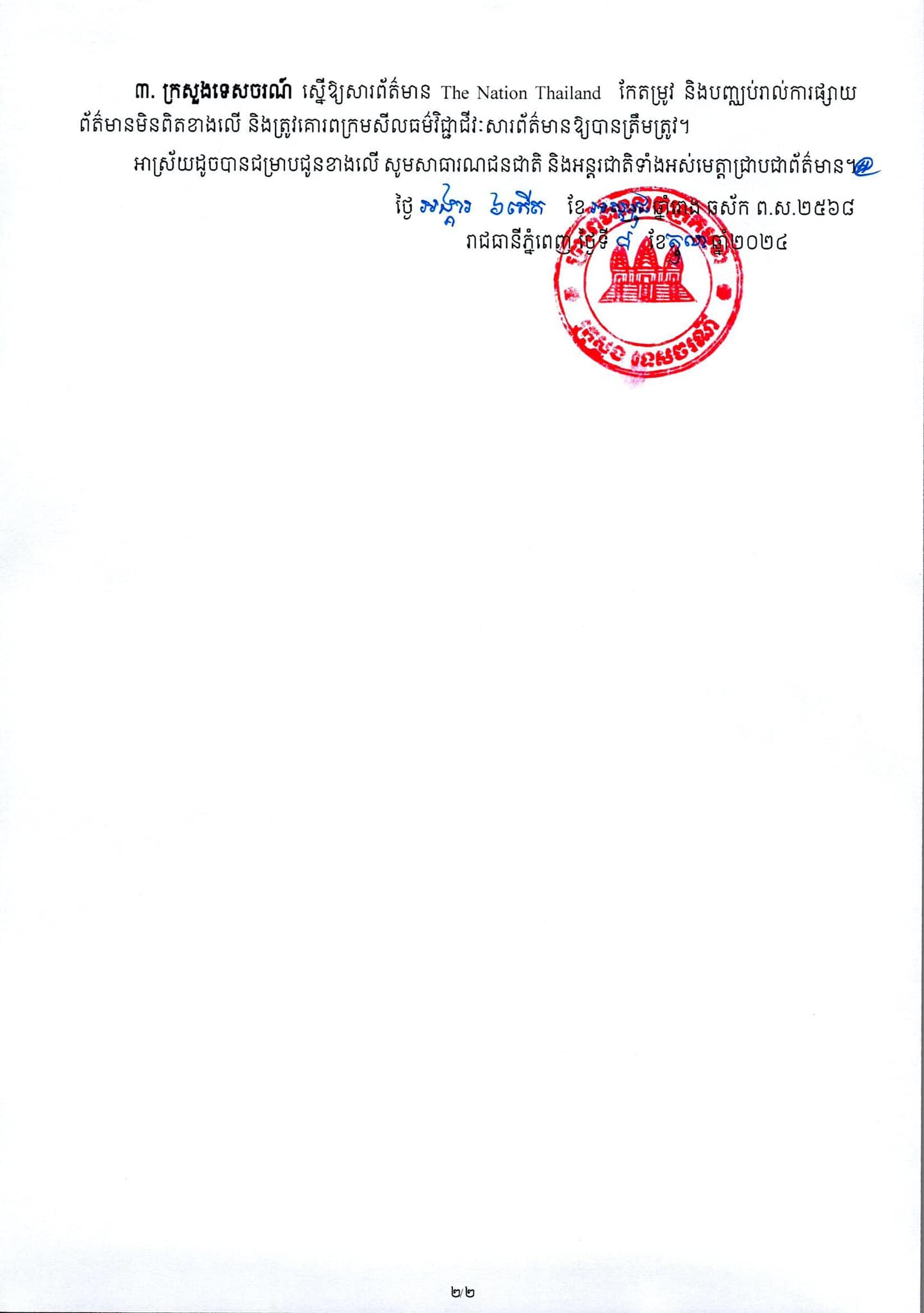 ចំណែកទី ៣ ក្រសួងទេសចរណ៍ស្នើឲ្យ The Nation Thailand កែតម្រូវព័ត៌មាន និងបញ្ឈប់ការផ្សាយព័ត៌មានមិនពិត៕ សូមអានសេចក្ដីប្រកាសរបស់ក្រសួងដូចនៅខាងក្រោមនេះ ដើម្បីឲ្យកាន់តែយល់ច្បាស់ពីអត្ថន័យ៖