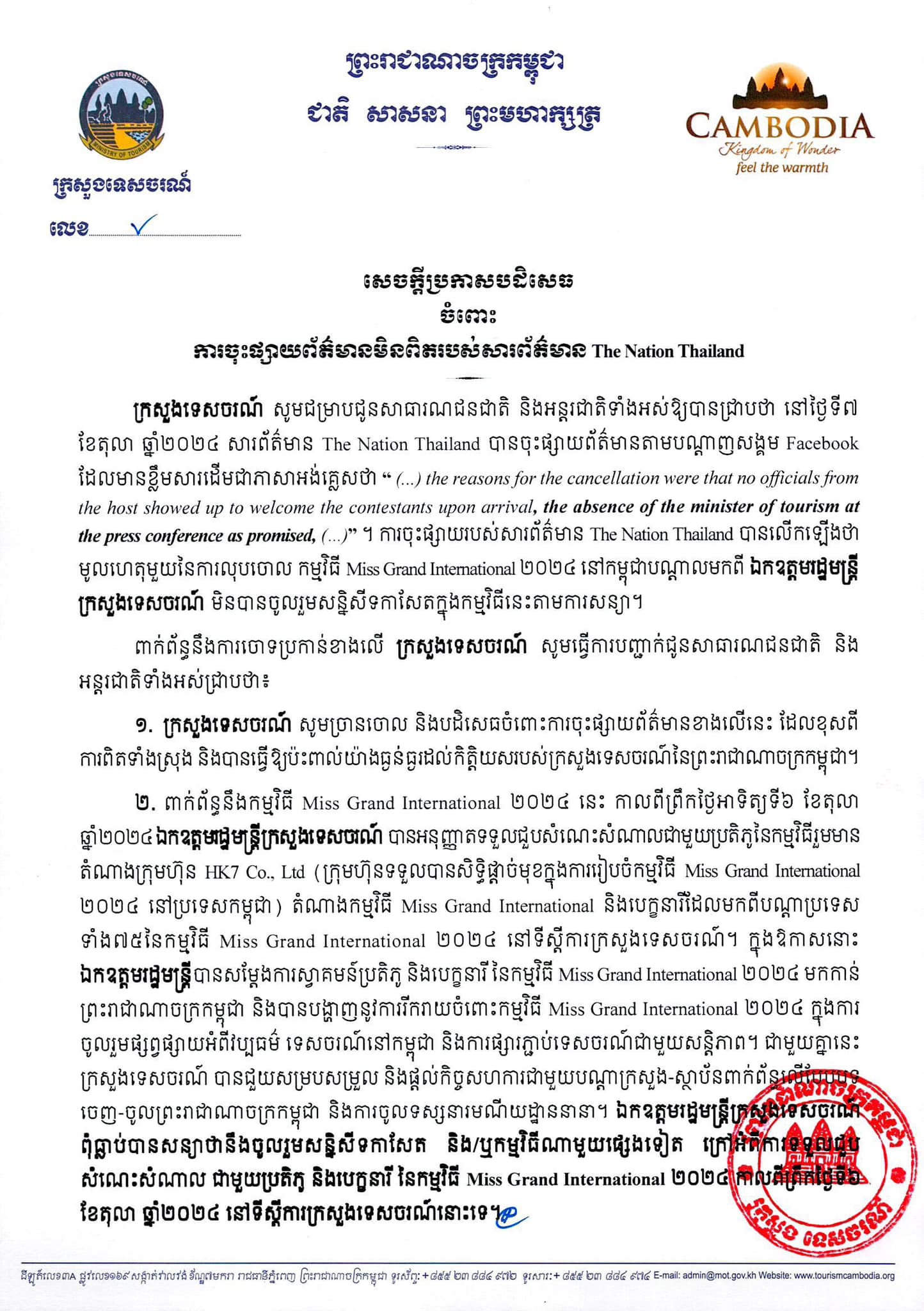 ក្រសួងទេសចរណ៍បានចេញសេចក្ដីប្រកាសបដិសេធ ចំពោះការចុះផ្សាយព័ត៌មានមិនពិតរបស់សារព័ត៌មាន The Nation Thailand បានចុះផ្សាយព័ត៌មានតាមបណ្ដាញសង្គម បានលើកឡើងថា មូលហេតុមួយនៃការលុបចោលកម្មវិធី Miss Grand International ២០២៤ នៅកម្ពុជាបណ្ដាលមកពី ឯកឧត្ដមរដ្ឋមន្ត្រីក្រសួងទេសចរណ៍ មិនបានចូលរួមសន្និសីទកាសែតក្នុងកម្មវិធីនេះ។