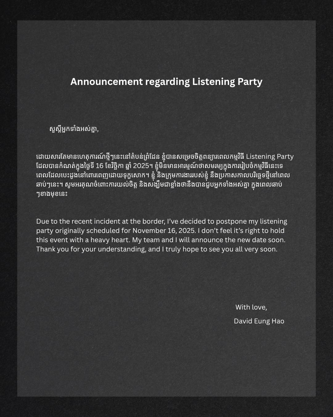 មួយ​វិញ​ទៀត ដេវីត អ៊ឺងហាវ ដែល​ជា​តារា​បង្ហាញ​ម៉ូត​ស្រក​ក្រោយ​ដ៏​មាន​ឥទ្ធិពល​១​រូប​ក៏​បាន​ចេញ​សេចក្ដី​ប្រកាស​ពន្យារពេល​កម្មវិធី Listening Party ដែល​បាន​កំណត់​ធ្វើ​នៅ​ថ្ងៃ​ទី ១៦ ខាង​មុខ​នេះ ដោយ​សារ​តែ​មាន​ផ្ទុះ​ហេតុការណ៍​នៅ​តំបន់​ព្រំ​ដែន​ហើយ​លោក​ និង​ក្រុម​ការងារ​យល់​ថា​ពេលវេលា​នេះ​មិន​សមរម្យ​ក្នុង​ការ​រៀប​ចំ​កម្មវិធី​នេះ​ឡើយ។