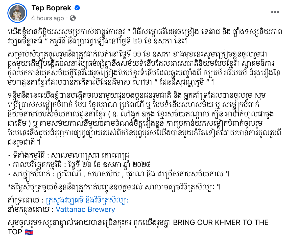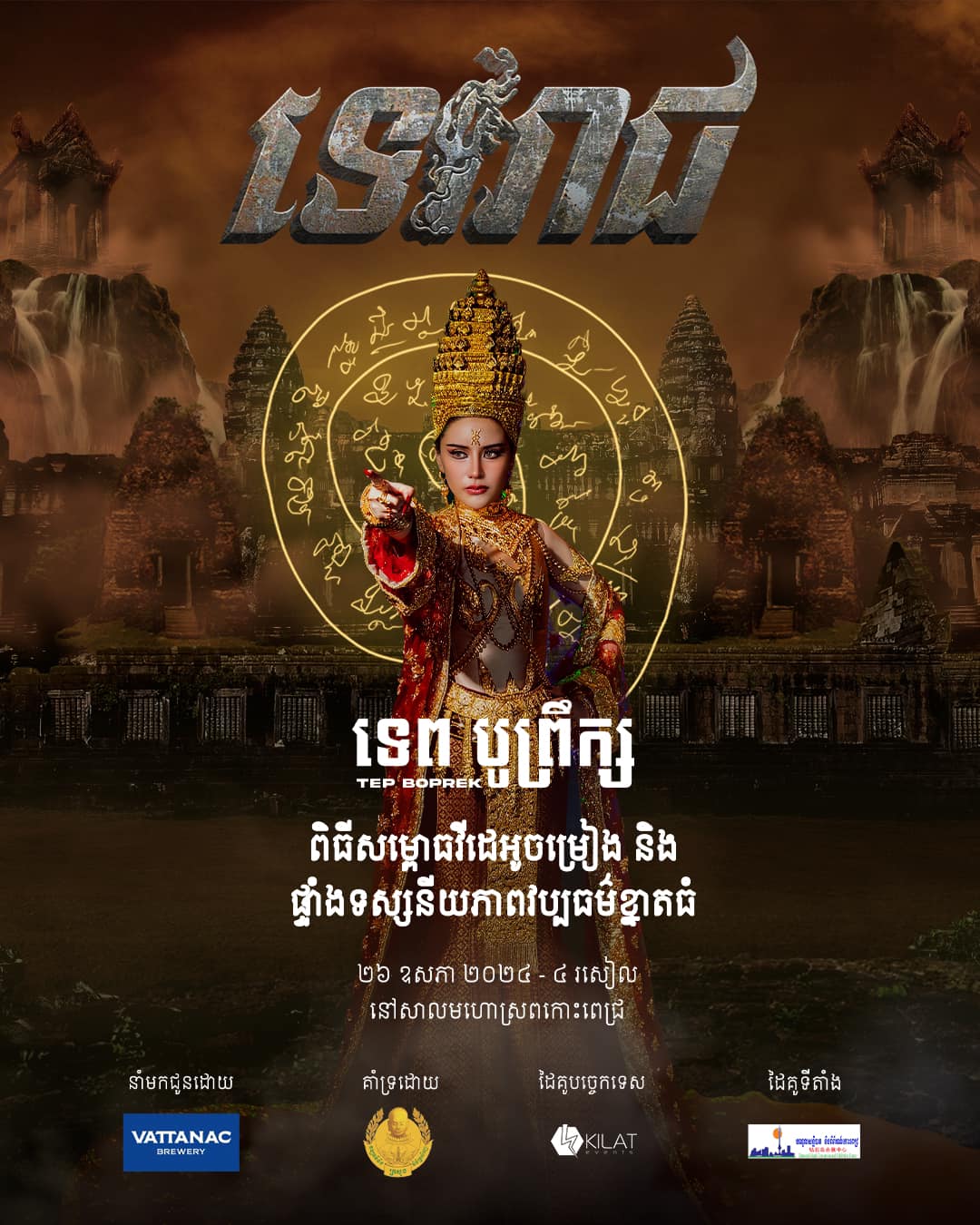 យោងតាមការបង្ហោះលើទំព័រហ្វេសប៊ុកផ្លូវការ Tep Boprek នៅព្រឹកថ្ងៃទី៩ ឧសភា នេះ បានឱ្យដឹងថា តារាចម្រៀងឯករាជ្យ ទេព បូព្រឹក្ស នឹងរៀបចំ «ពិធីសម្ពោធវីដេអូចម្រៀង ទេវរាជ និង ផ្ទាំងទស្សនីយភាពវប្បធម៌ខ្នាតធំ» នៅថ្ងៃទី២៦ ខែឧសភា ឆ្នាំ២០២៤ នៅសាលមហោស្រព កោះពេជ្រ។