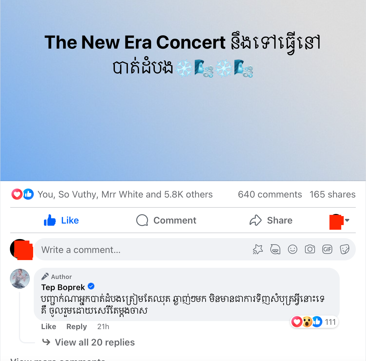 គ្រាន់តែឃើញការប្រកាសនេះភ្លាម ហ្វេនៗរបស់ ទេព បូព្រឹក្ស សប្បាយចិត្តជាខ្លាំង និងបាននាំគ្នា Comment ស្វាមគន៍តារាចម្រៀងស្រីរូបនេះទុកមុនជាស្រេចបាត់ហើយ ថែមទាំងបានបបួលមិត្តភ័ក្តឱ្យត្រៀមទៅទស្សនាការប្រគំតន្រ្តី The New Era Concert របស់តារាចម្រៀងរូបនេះទៀតផង។