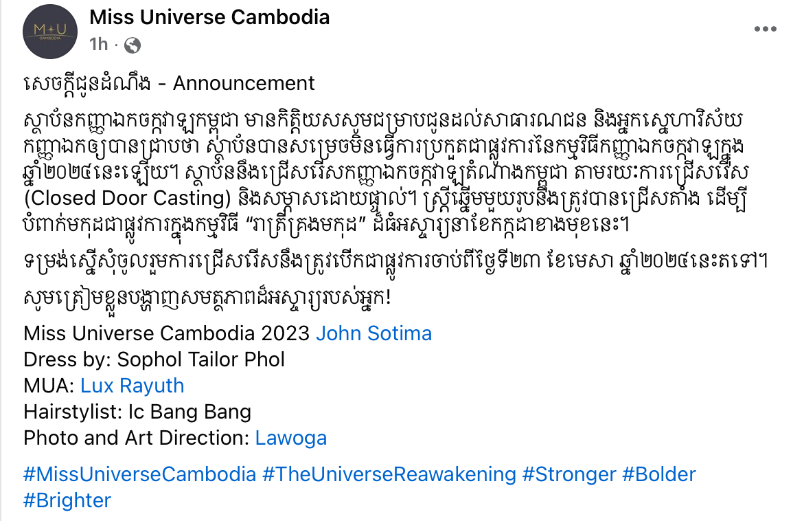 យ៉ាងណាមិញ គេពុំទាន់ដឹងថា បេក្ខភាពណាខ្លះដែលនឹងស្នើសុំចូលរួម Closed Door Casting និងសម្ភាសន៍ដោយផ្ទាល់ ដើម្បីគ្រងតំណែង Miss Universe Cambodia 2024 បន្ទាប់ពី កញ្ញា ចន សុទីម៉ា ជា Miss Universe Cambodia 2023។ រង់ចាំអ៊ុតមើលការ update ថ្មីៗលើទំព័រហ្វេសប៊ុកផ្លូវការ Miss Universe Cambodia ទាំងអស់គ្នា!