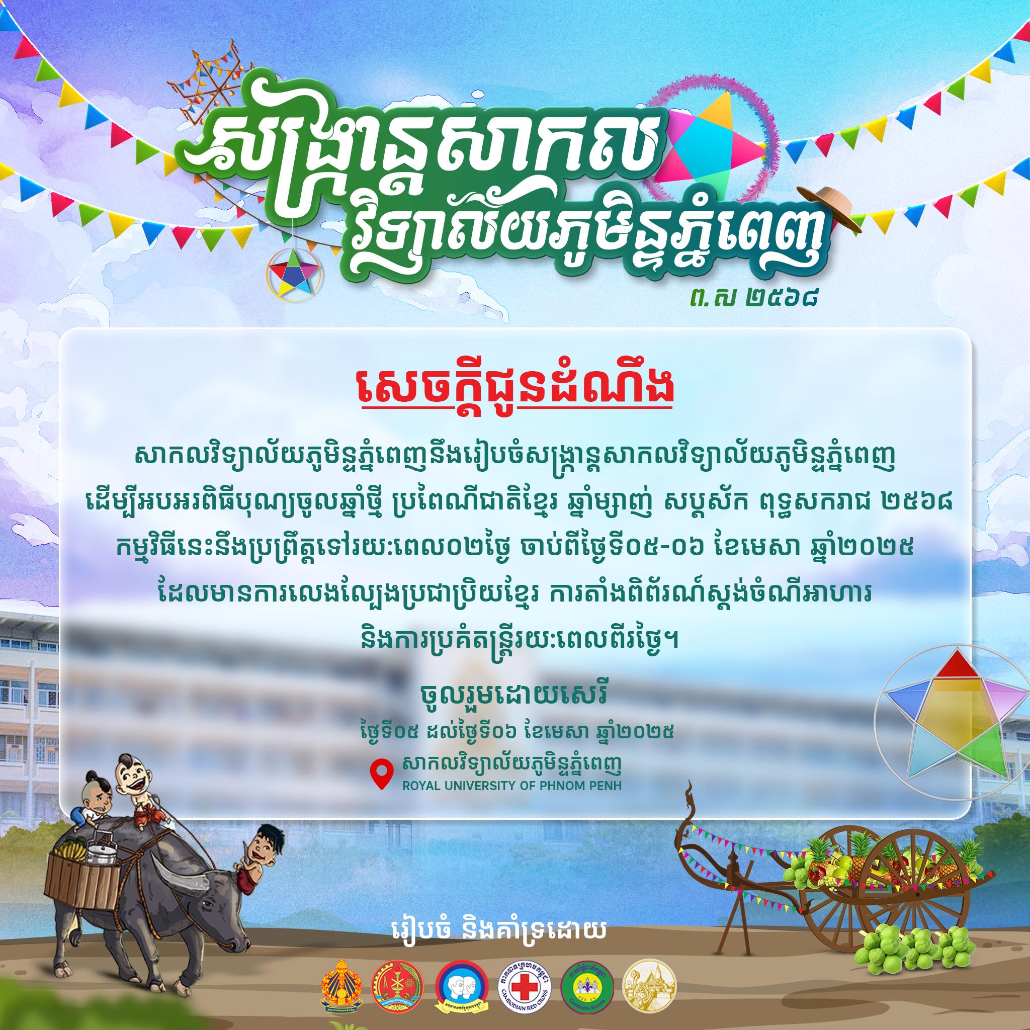 សាកលវិទ្យាល័យភូមិន្ទភ្នំពេញនឹងរៀបចំកម្មវិធីសង្ក្រាន្តរយៈពេល២ថ្ងៃជាប់គ្នានៅថ្ងៃទី ៥,៦ ខែមេសា ឆ្នាំ២០២៥ នៅក្នុងទីតាំងសាលាផ្ទាល់ដោយក្នុងនោះមានការលេងល្បែងប្រជាប្រិយខ្មែរ ការតាំងពិព័រណ៍ស្តង់ចំណីអាហារ ការប្រគំតន្ត្រីពិសេសដែលមានការចូលរួមពី ក្រុមតួត្លុក រិទ្ធ ដារ៉ូ និង មុំវណ្ណ ដាវីន , Sambath Sok – សុខ សម្បត្តិ , ឆដា , Bee Emm , ថាន់ នឿថង , យ៉ាន់ សុជាតា , Jady , YUHAI ។