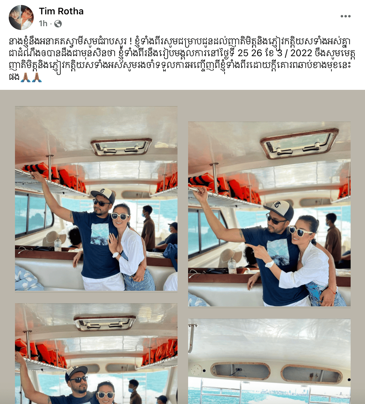 បន្ទាប់ពី​ខកខាន​ការ​រៀបចំ​ពិធី​មង្គលការ​កាលពី​ថ្ងៃ​ទី ២២ ខែ​កុម្ភៈ ឆ្នាំ ២០២២ ម្ដង​រួចមកហើយនោះ តារា​ម៉ូដែល​ចាស់​វស្សា និង​ជា​តារា​សម្ដែង ទឹម រដ្ឋា នៅ​ព្រឹក​ថ្ងៃទី ១០ ខែ​កុម្ភៈ​នេះ បាន​ប្រកាស​ឱ្យ​ដឹង​ជា​សាធារណៈ​ថា នាង​ត្រៀម​នឹង​ដឹកដៃ​អនាគត​ស្វាមី​ក្រាប​ផ្ទឹម​តាម​ប្រពៃណី​ខ្មែរ​នៅ​ថ្ងៃ​ទី ២៥,២៦ ខែ មីនា ឆ្នាំ ២០២២ ខាង​មុខ​នេះ។