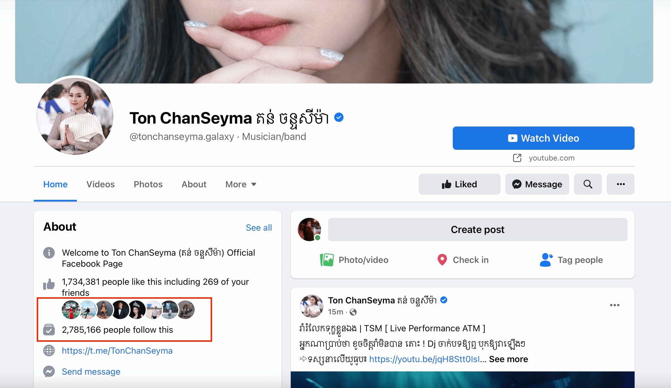 ក្រឡេកមកមើលបណ្តាញសង្គមហ្វេសប៊ុកវិញនោះ តន់ ច័ន្ទសីម៉ា មិនទាន់អាចទម្លាក់តំណែងតារាស្រីកំពូលៗបាននៅឡើយទេ តួយ៉ាង តារាស្រីដែលមានអ្នកតាមដានច្រើនបំផុតលើបណ្តាញសង្គមហ្វេសប៊ុកនាពេលនេះ នៅតែជា តារាចម្រៀង មាស សុខសោភា ដែលមាន follower 5.6M , ពេជ្រ សោភា 4M , ឱក សុគន្ធកញ្ញា 3.8M , បន្ទាប់មកទើប តន់ ច័ន្ទសីម៉ា មាន follower 2.7M ឈរនៅលំដាប់ទី៤៕