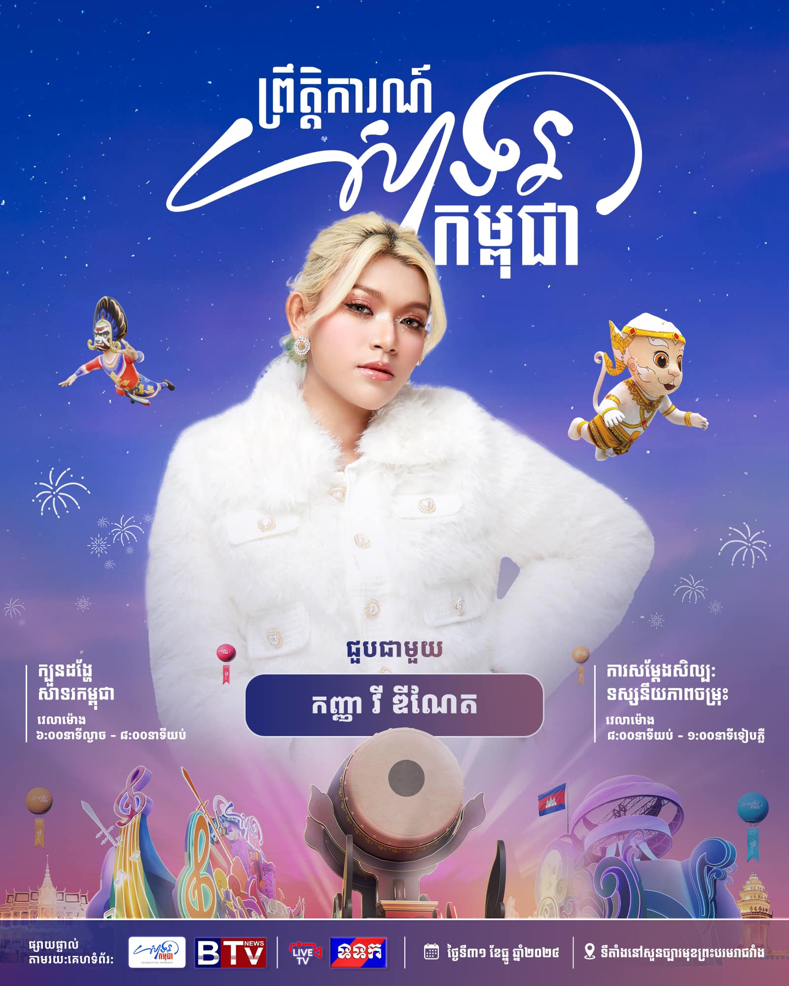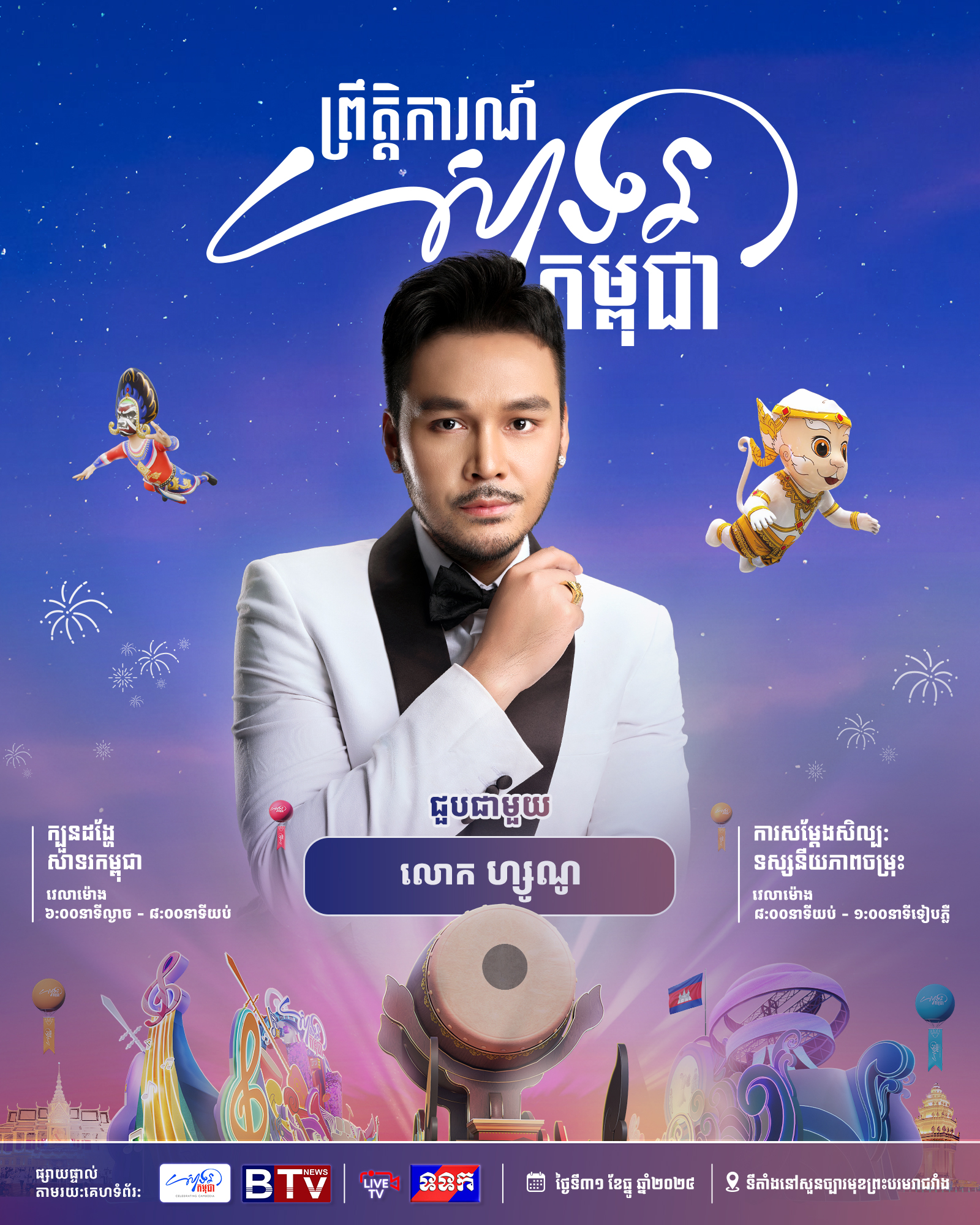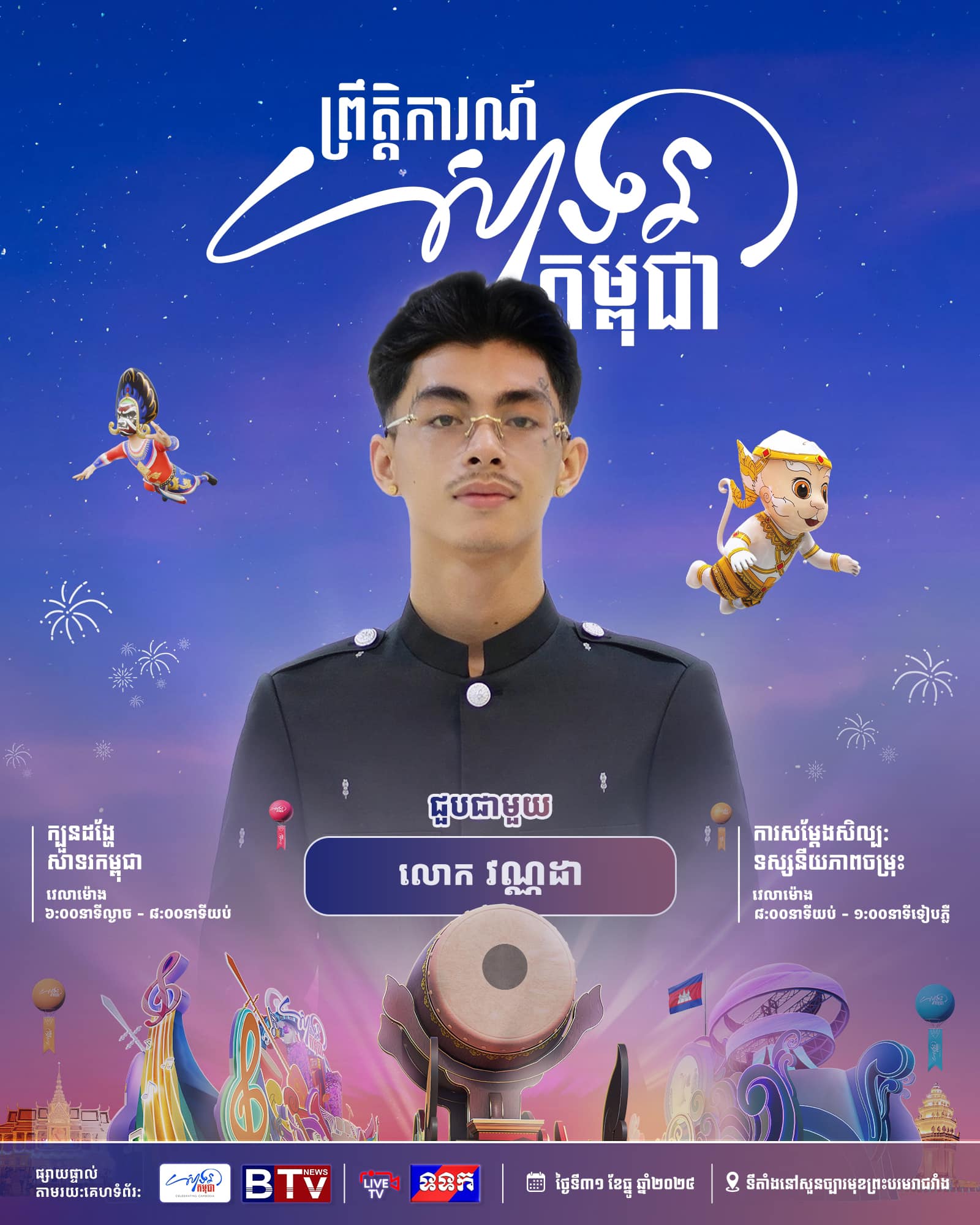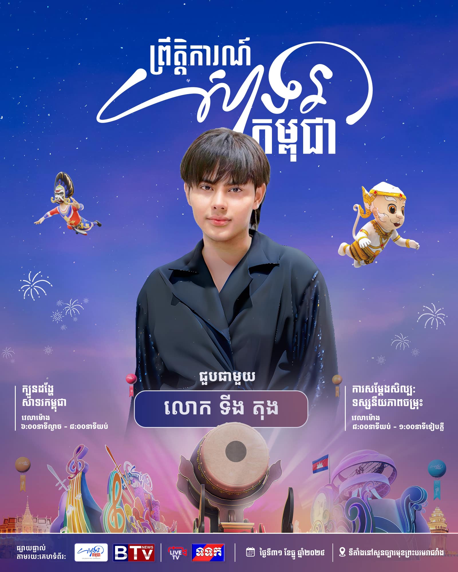 កុំភ្លេចចូលរួមទាំងអស់គ្នាដោយកម្មវិធីនេះនឹងចាប់ផ្ដើមពីម៉ោង ៣ រសៀល រហូតដល់ម៉ោង ១ រំលងអាធ្រាត្រ នៅបរិវេណសួនព្រះបរមរាជវាំង រាជធានីភ្នំពេញ។
