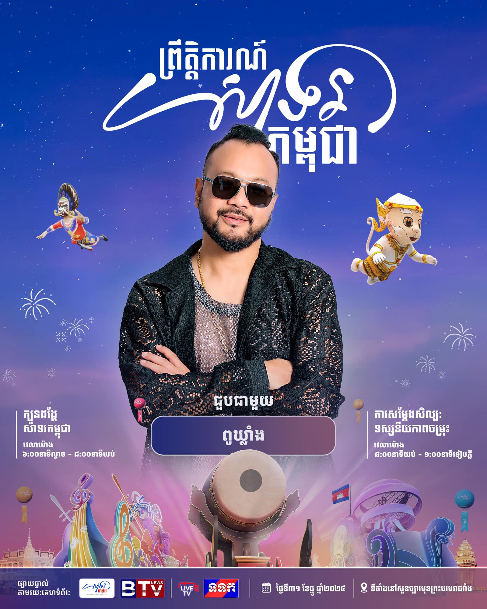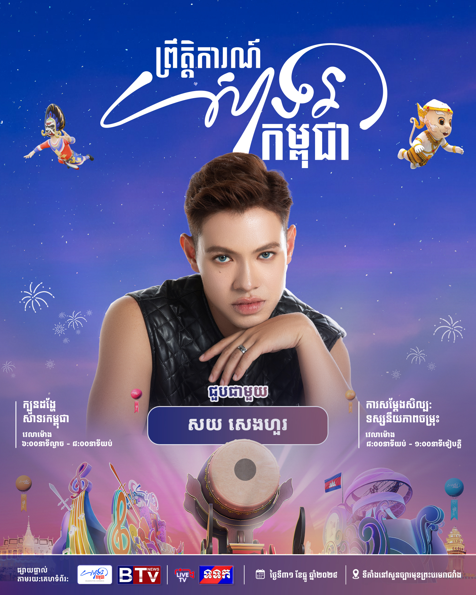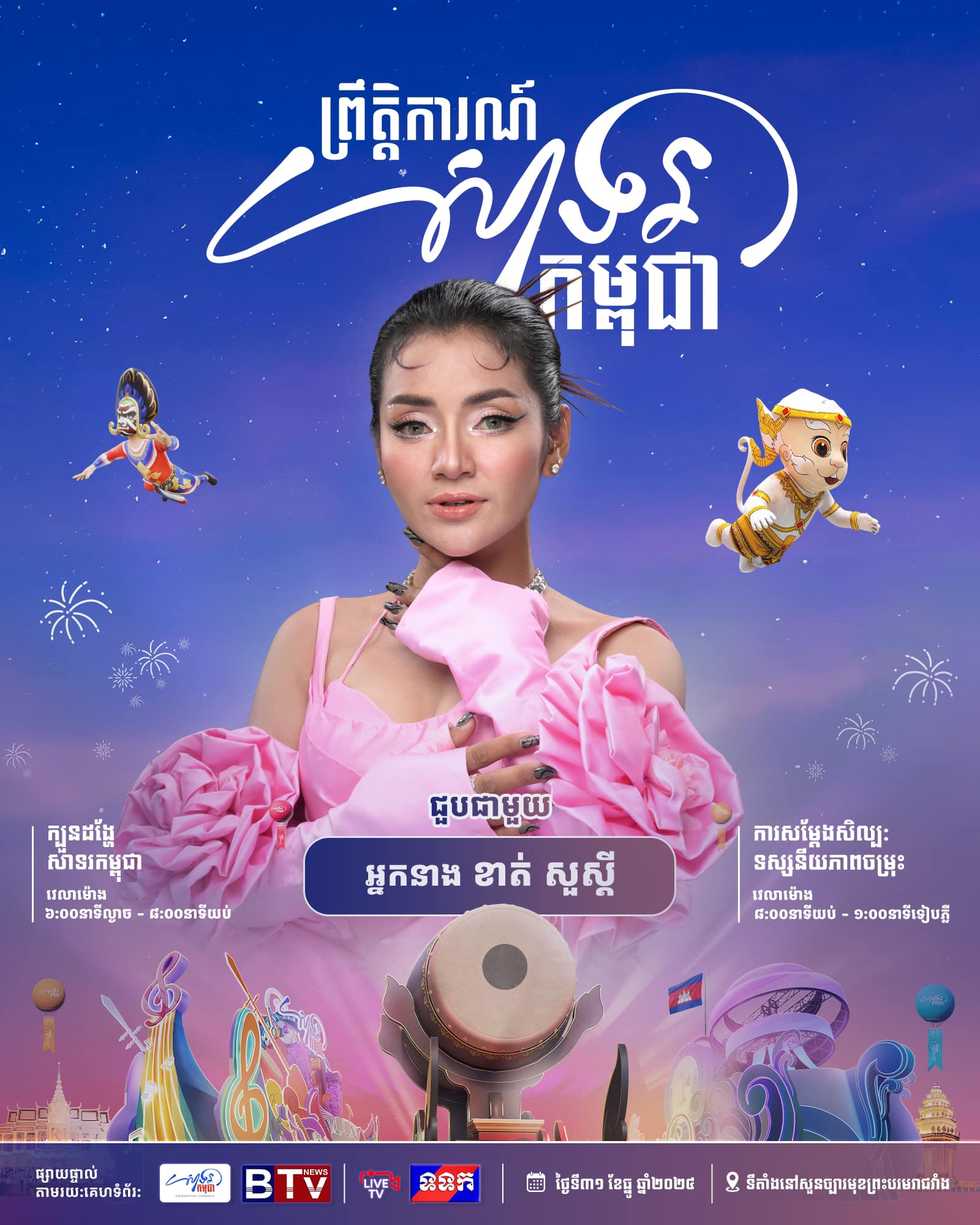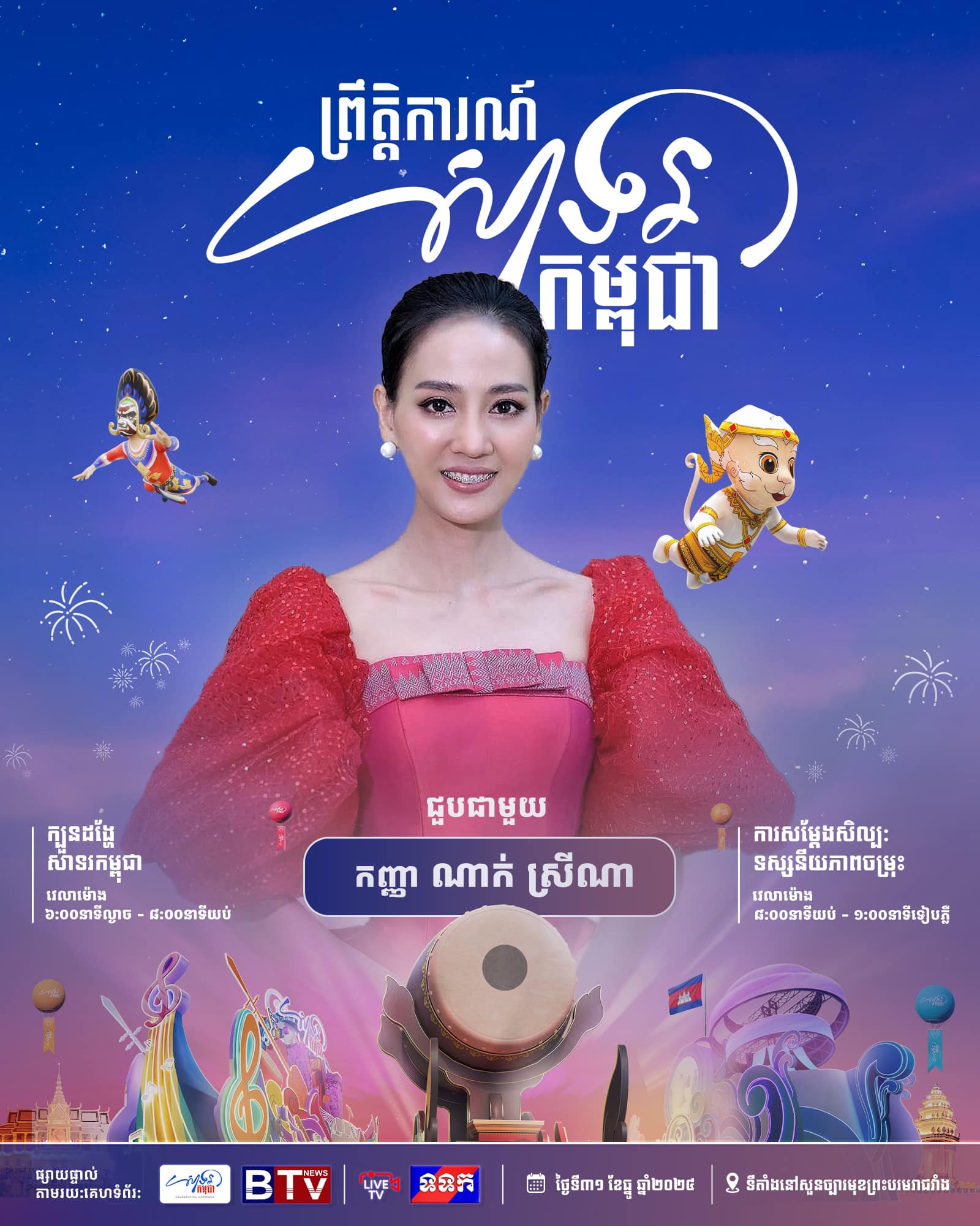 ព្រឹត្តិការណ៍ «សាទរកម្ពុជា» នៅថ្ងៃទី៣១ ខែធ្នូ ឆ្នាំ២០២៤ នេះនឹងមានកម្មវិធីពិសេសៗ ក៏ដូចជាការសម្តែងសិល្បៈចម្រុះពីសិល្បករសិល្បការិនីល្បីៗជាច្រើនរូប ដើម្បីស្វាគមន៍ឆ្នាំថ្មី។
