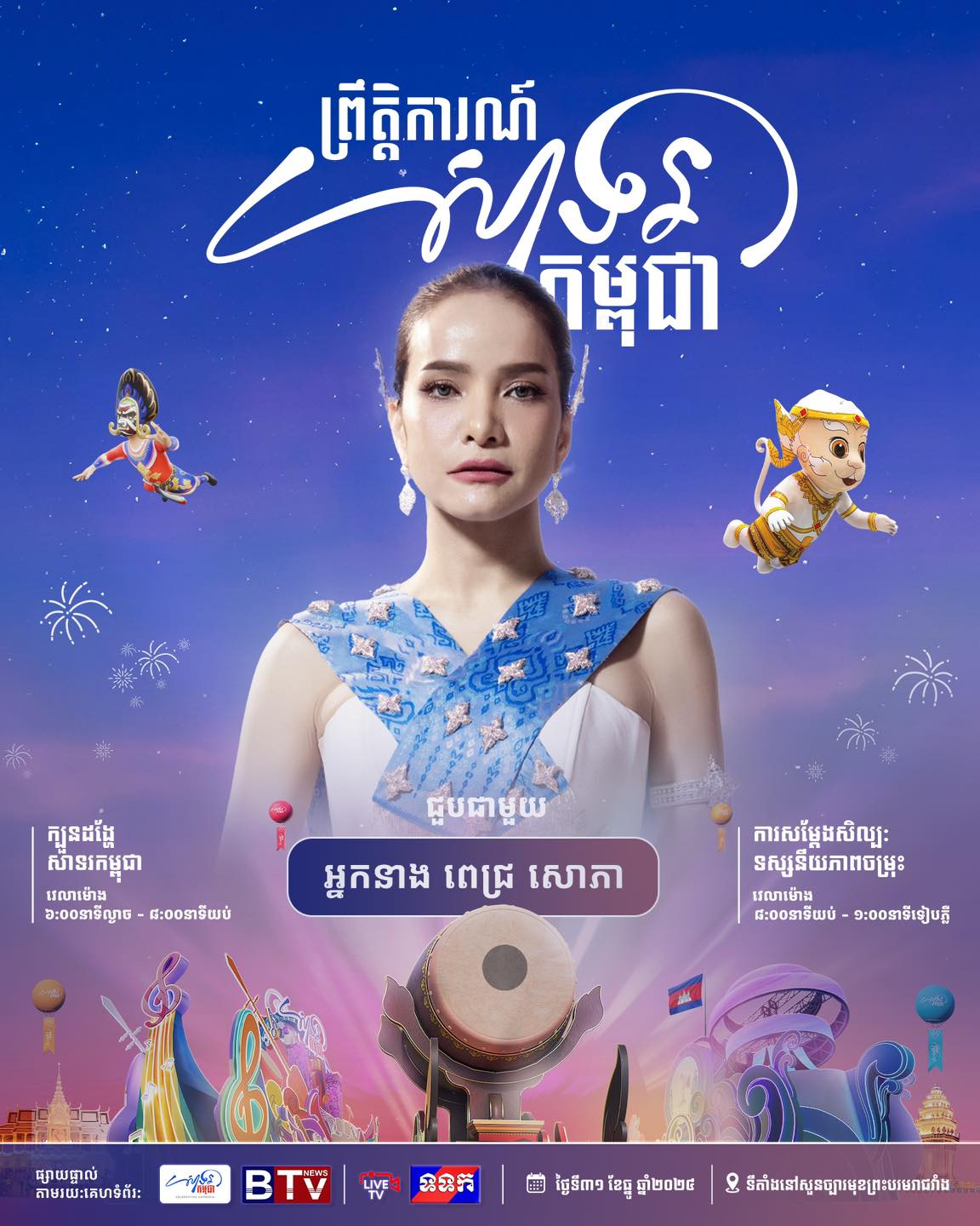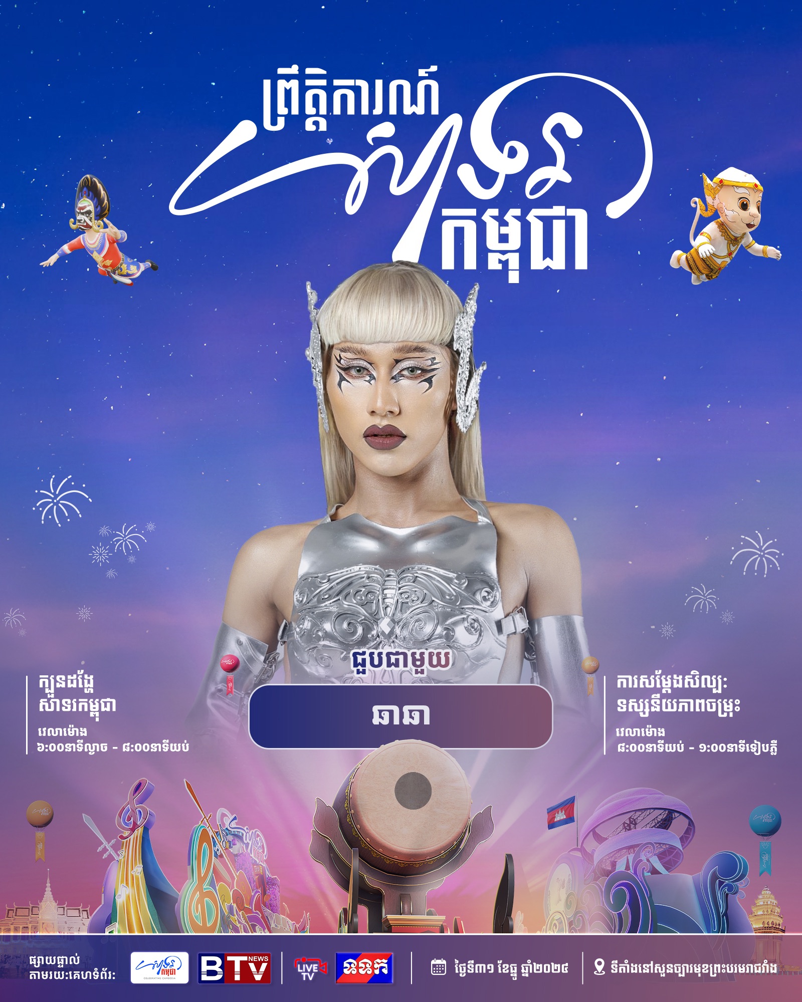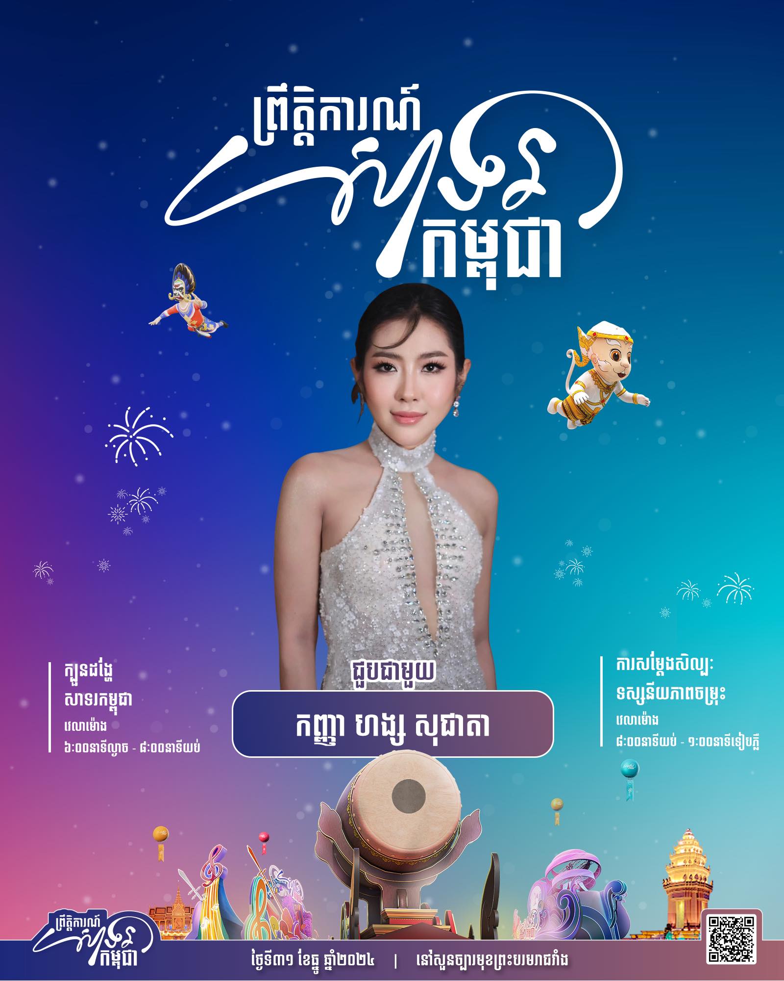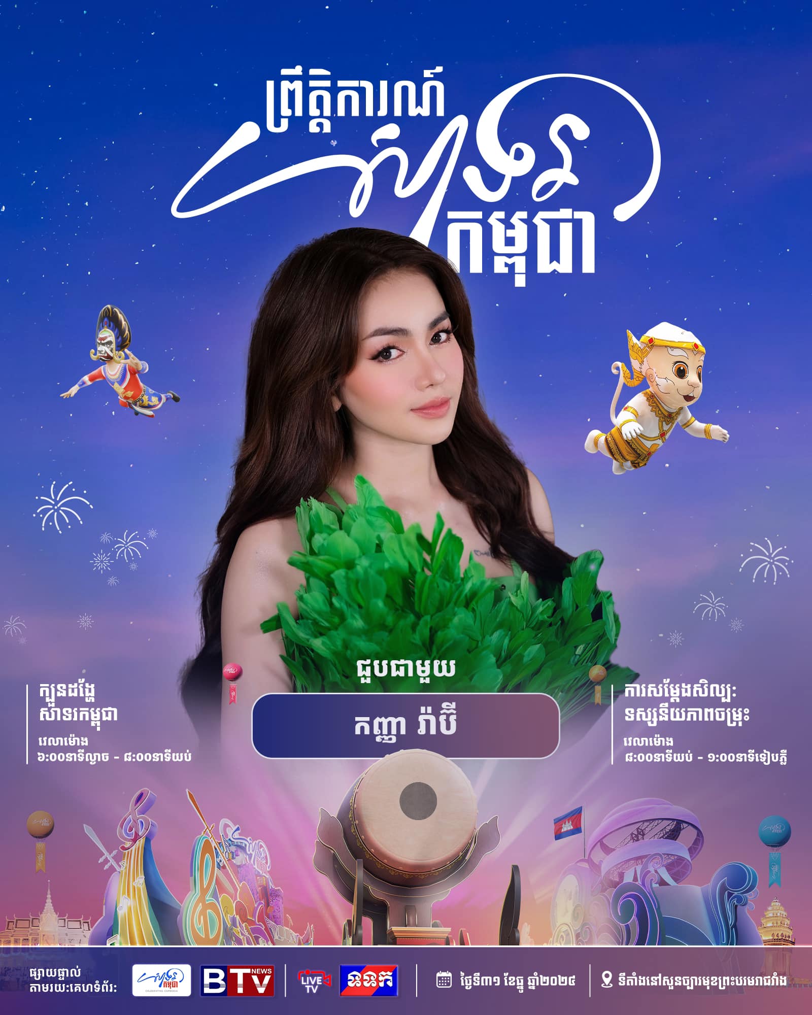 ព្រឹត្តិការណ៍ «សាទរកម្ពុជា» នៅថ្ងៃទី៣១ ខែធ្នូ ឆ្នាំ២០២៤ នេះនឹងមានកម្មវិធីពិសេសៗ ក៏ដូចជាការសម្តែងសិល្បៈចម្រុះពីសិល្បករសិល្បការិនីល្បីៗជាច្រើនរូប ដើម្បីស្វាគមន៍ឆ្នាំថ្មី។