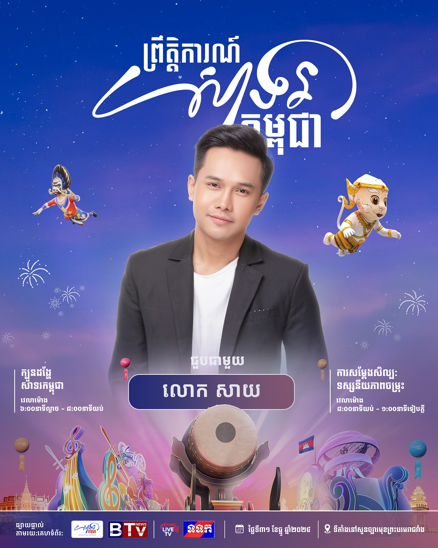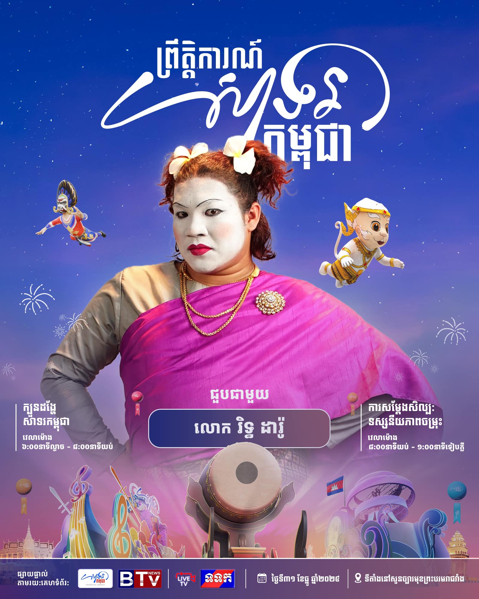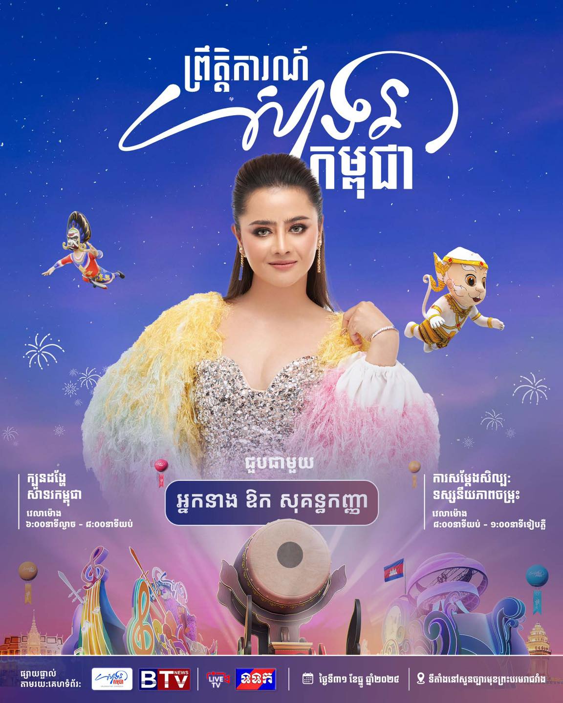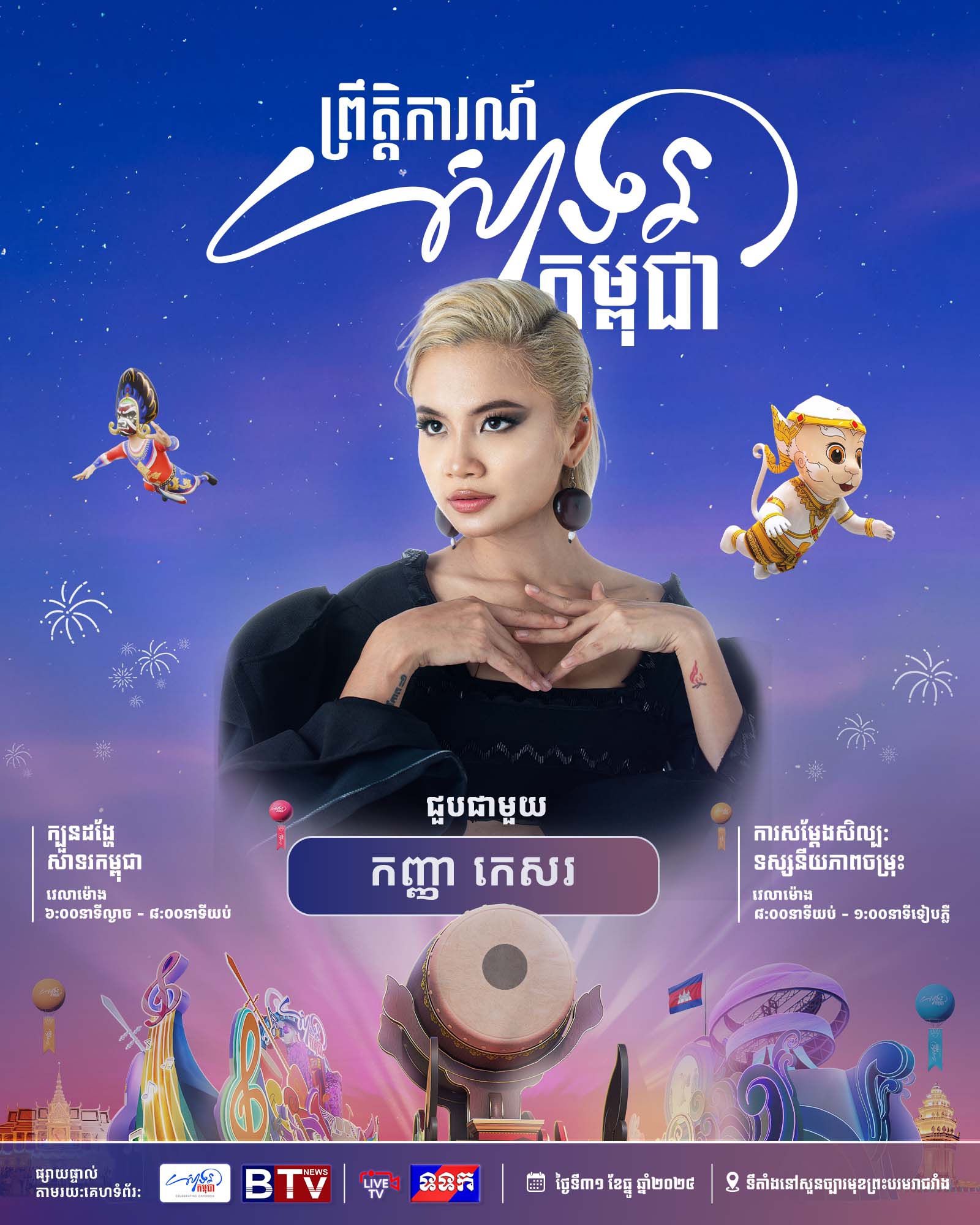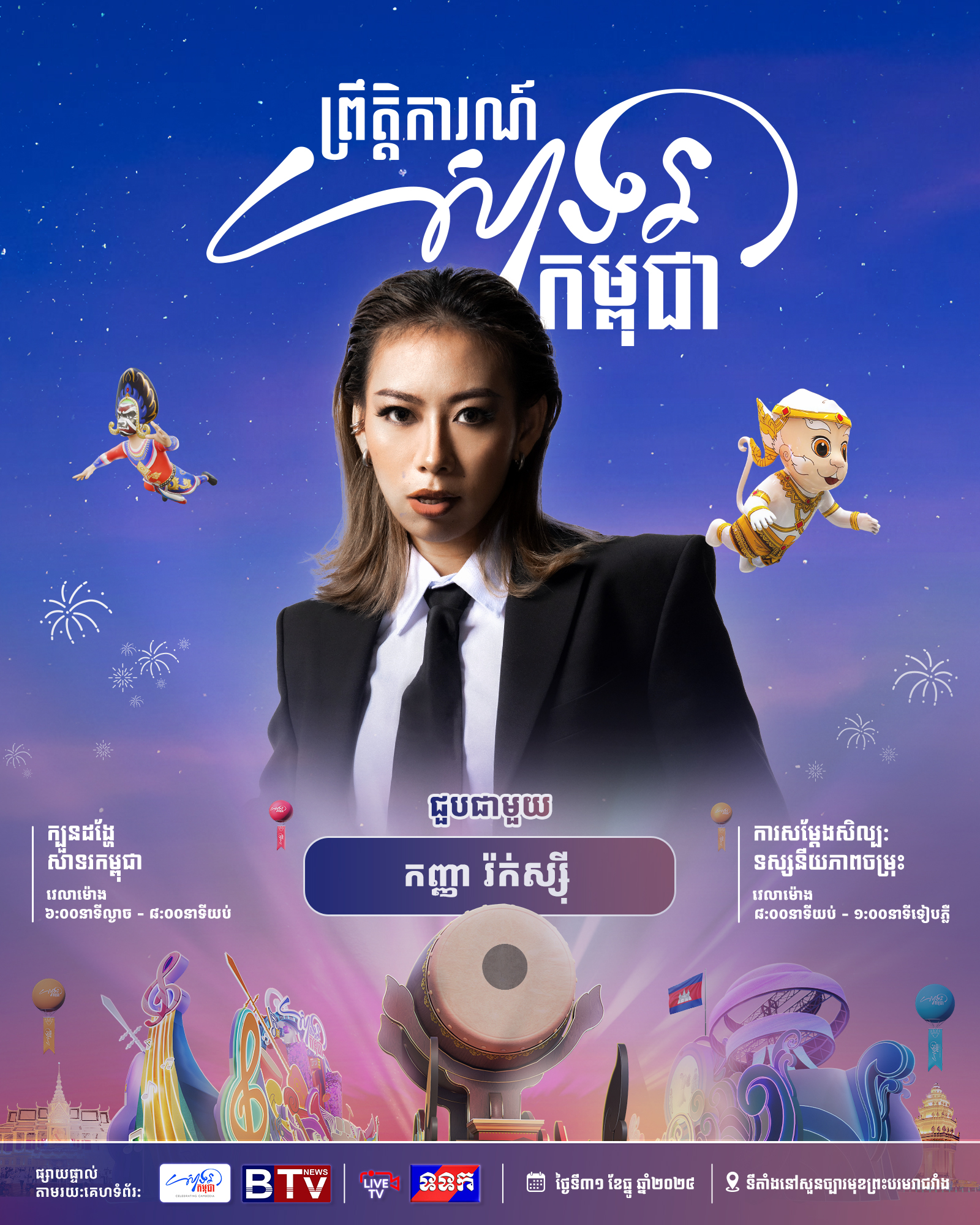 ព្រឹត្តិការណ៍ «សាទរកម្ពុជា» នៅថ្ងៃទី៣១ ខែធ្នូ ឆ្នាំ២០២៤ នេះនឹងមានកម្មវិធីពិសេសៗ ក៏ដូចជាការសម្តែងសិល្បៈចម្រុះពីសិល្បករសិល្បការិនីល្បីៗជាច្រើនរូប ដើម្បីស្វាគមន៍ឆ្នាំថ្មី។