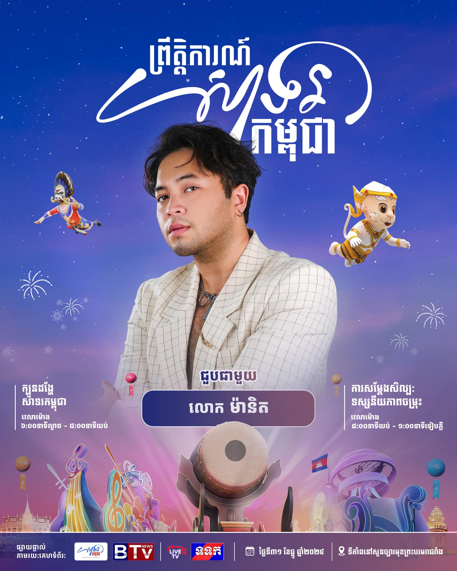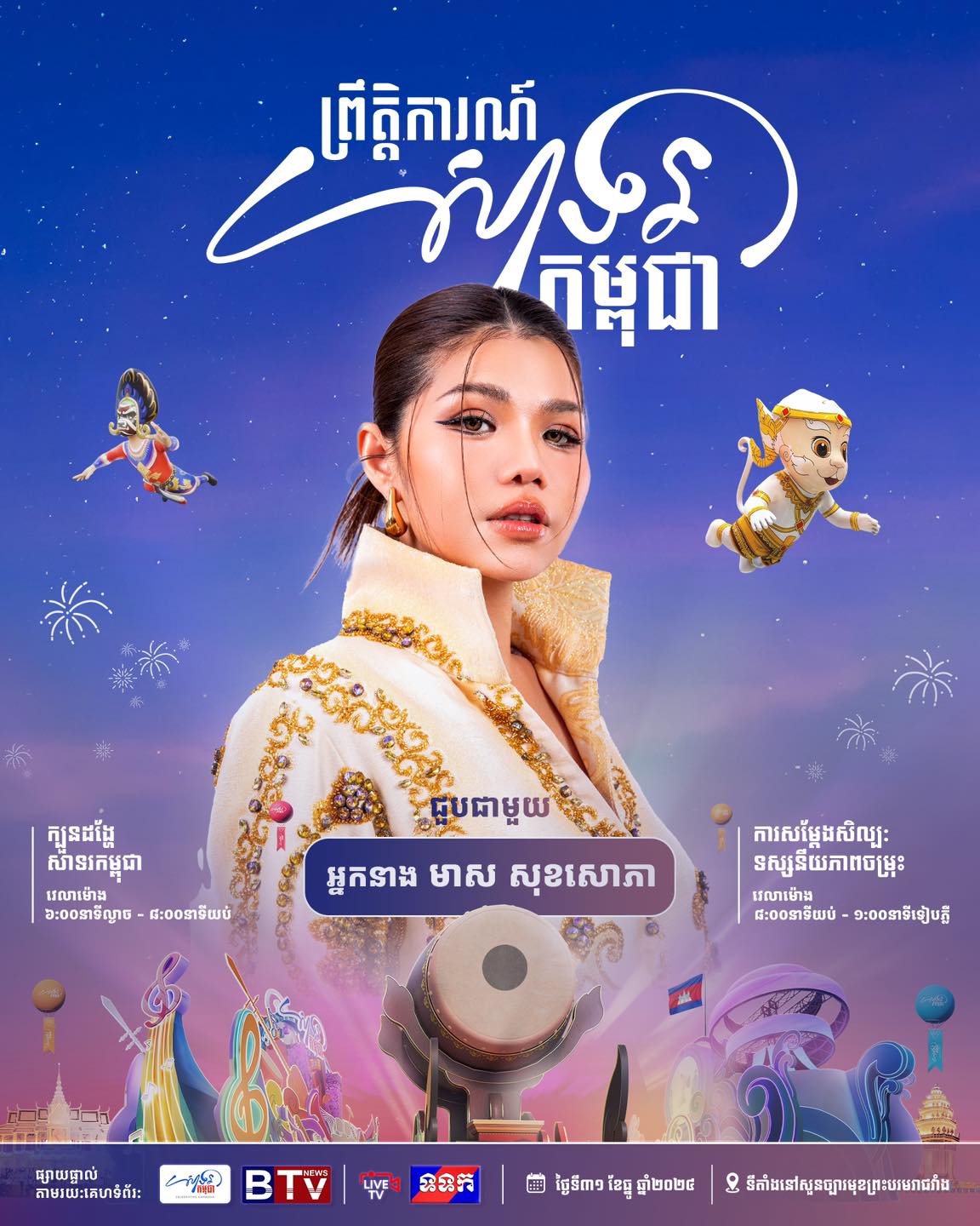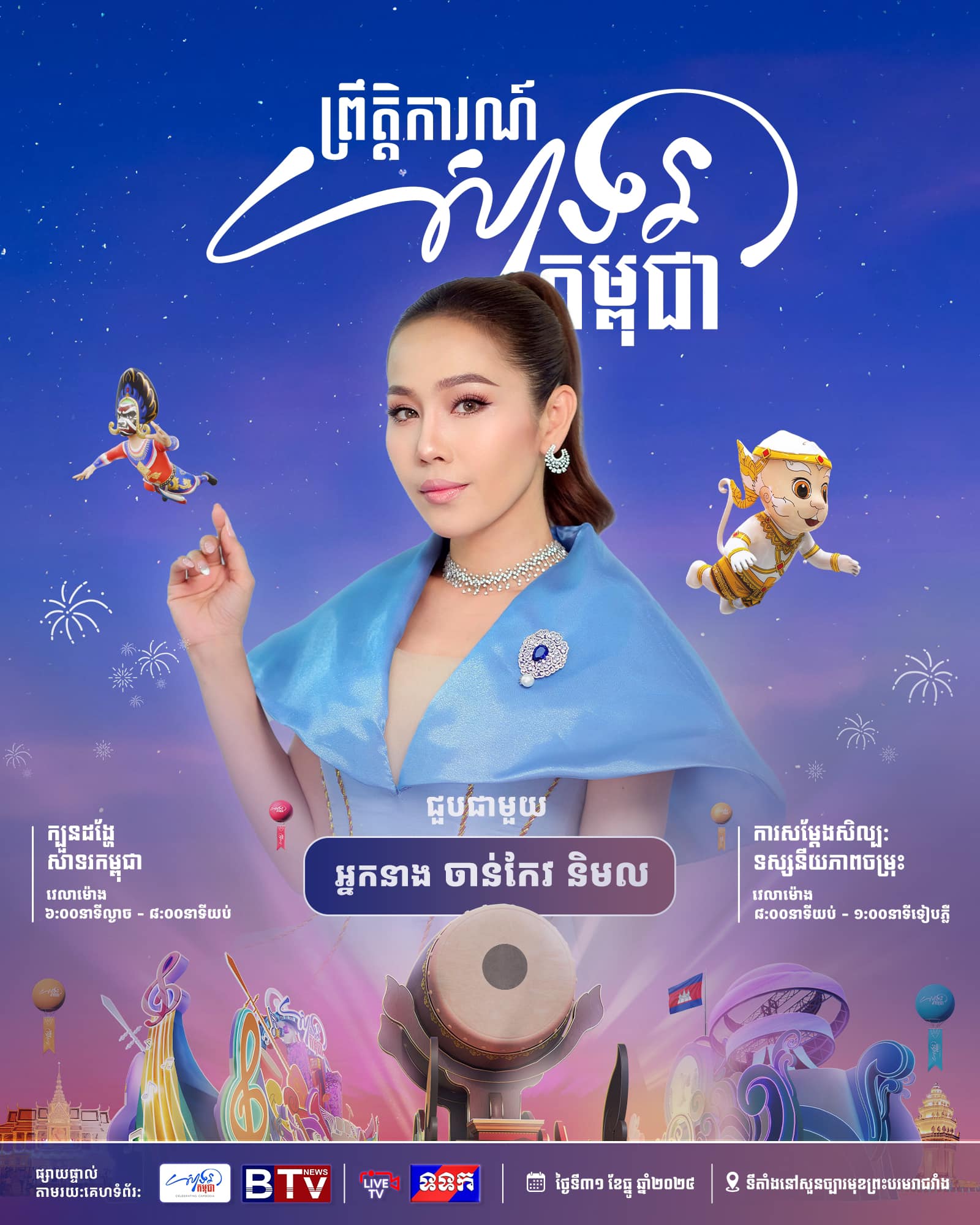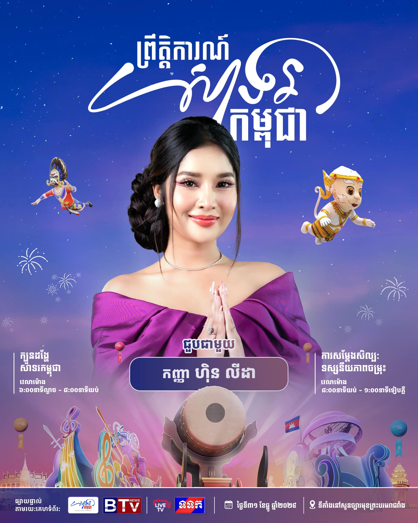 ព្រឹត្តិការណ៍ «សាទរកម្ពុជា» នៅថ្ងៃទី៣១ ខែធ្នូ ឆ្នាំ២០២៤ នេះនឹងមានកម្មវិធីពិសេសៗ ក៏ដូចជាការសម្តែងសិល្បៈចម្រុះពីសិល្បករសិល្បការិនីល្បីៗជាច្រើនរូប ដើម្បីស្វាគមន៍ឆ្នាំថ្មី។