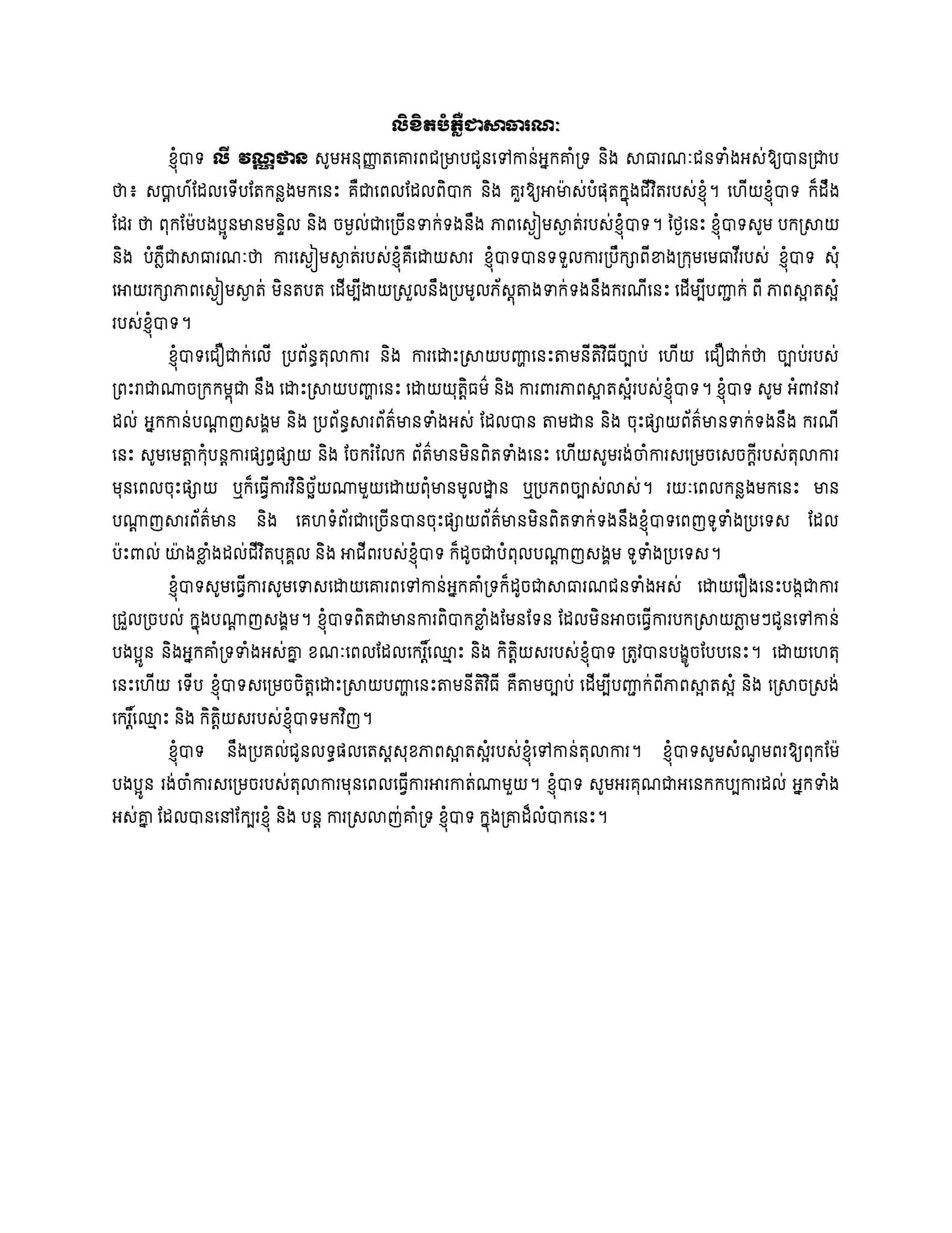 មួយទៀតនោះ លោកក៏បានអំពាវនាវទៅដល់ប្រព័ន្ធផ្សព្វផ្សាយមួយចំនួនដែលបានចុះផ្សាយព័ត៌មានមិនពិតទាក់ទងនិងរូបលោកសុំមេត្តាកុំបន្តផ្សព្វផ្សាយ ព្រមទាំងចែករំលែកទៀត ព្រោះថាការចុះផ្សាយនូវព័ត៌មានមិនពិតបែបនេះ ពិតជាប៉ះពាល់ដល់ខ្លាំងទៅដល់ជីវិតបុគ្គល អាជីព និងបំពុលដល់សង្គមជាខ្លាំង។
