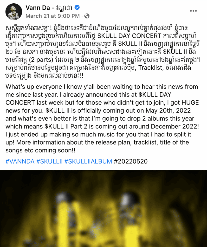 យោងតាមការបង្ហោះរបស់ទំព័រហ្វេសប៊ុកផ្លូវការតារាចម្រៀងមានប្រភពចេញពីខេត្តកំពង់សោម ឱ្យដឹងថា៖ «សួស្ដីអ្នកទាំងអស់គ្នា! ខ្ញុំដឹងថានេះគឺជាដំណឹងមួយដែលអ្នករាល់គ្នាកំពុងរង់ចាំ ខ្ញុំបានធ្វើការប្រកាសម្ដងរួចមកហើយកាលពីថ្ងៃ SKULL DAY CONCERT កាល​ពីសបា្ដហ៍មុន។ ហើយសម្រាប់ហ្វេនៗដែលមិនបានចូលរួម គឺ $KULL II នឹងចេញជាផ្លូវការនាថ្ងៃទី​ ២០ ខែ ឧសភា ខាងមុខនេះ ហើយអ្វីដែលពិសេសជាងនេះទៀតនោះគឺ $KULL II នឹងមានពីរវគ្គ (2 parts) ដែលវគ្គ ២ នឹងចេញផ្លូវការនៅក្នុងឆ្នាំតែមួយនៅចុងឆ្នាំនេះតែម្ដង។ សម្រាប់ព័ត៍មានបន្ថែមដូចជា គម្រោងនៃការចេញអាល់ប៊ុម, Tracklist, ចំណងជើងបទចម្រៀង នឹងមកដល់ឆាប់ៗនេះ!!