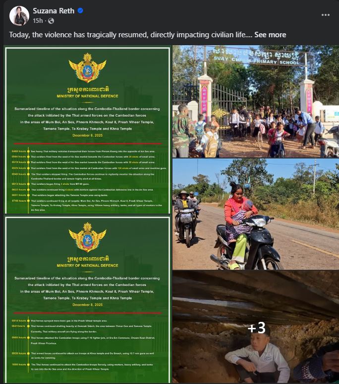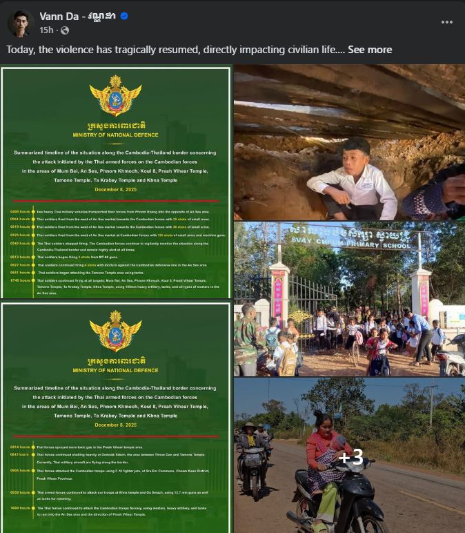 គួរឱ្យដឹងថា ថៃបានបើកការបាញ់ប្រហារមកលើកម្ពុជាជាថ្មីម្ដងទៀតនាវេលាព្រឹកថ្ងៃទី ៨ ខែ ធ្នូ ឆ្នាំ ២០២៥ និងបានពង្រីកភូមិសាស្ត្រនៃការបាញ់ប្រហារទៅដល់តំបន់ជាច្រើនដែលនៅជាប់ព្រំដែន។ គិតត្រឹមម៉ោង ៦ ព្រឹកថ្ងៃ៩ ធ្នូ នេះ ការបាញ់ប្រហាររបស់ទ័ពសៀមមកលើទីតាំងរស់នៅរបស់ពលរដ្ឋកម្ពុជាបណ្ដាលឱ្យមនុស្ស ២៧ នាក់ស្លាប់និងរងរបួស។ នេះបើតាមព័ត៌មានបឋមដែលក្រសួងការពារជាតិទទួលបានពីអាជ្ញាធរខេត្ត៕