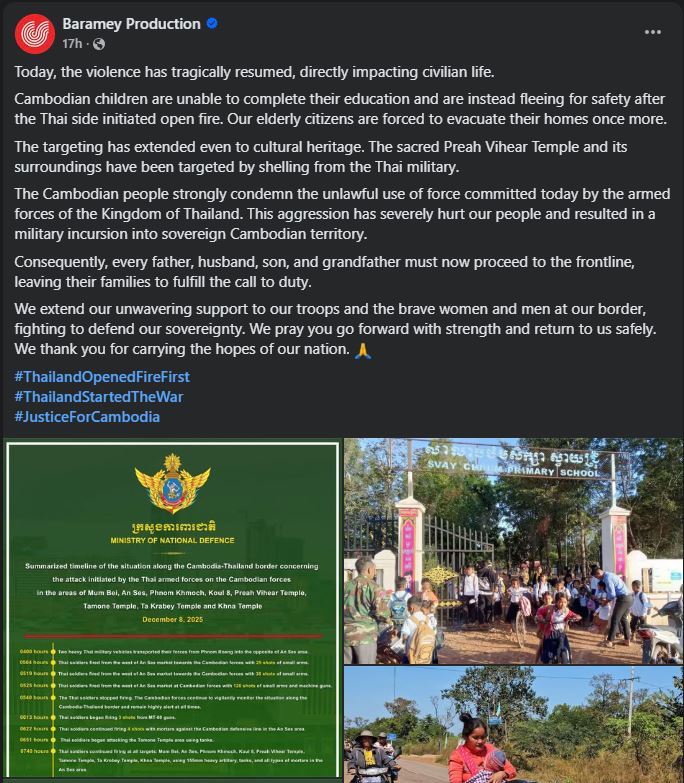 ផលិតកម្ម បារមី ព្រមទាំងសិល្បករពហុជំនាញដែលមានដូចជា វណ្ណដា វណ្ណថាន នរិទ្ធ ហ្សាណា និង យូហៃ បាននាំគ្នាចេញមុខបង្ហោះលើផេកផ្លូវការរបស់ពួកគេក្រោយការបាញ់ប្រហាររបស់ទ័ពសៀមមកលើដែនអធិបតេយ្យភាព និងទីតាំងរស់នៅរបស់ពលរដ្ឋស៊ីវិលស្លូតត្រង់នៅតាមខ្សែបន្ទាត់ព្រំដែន។