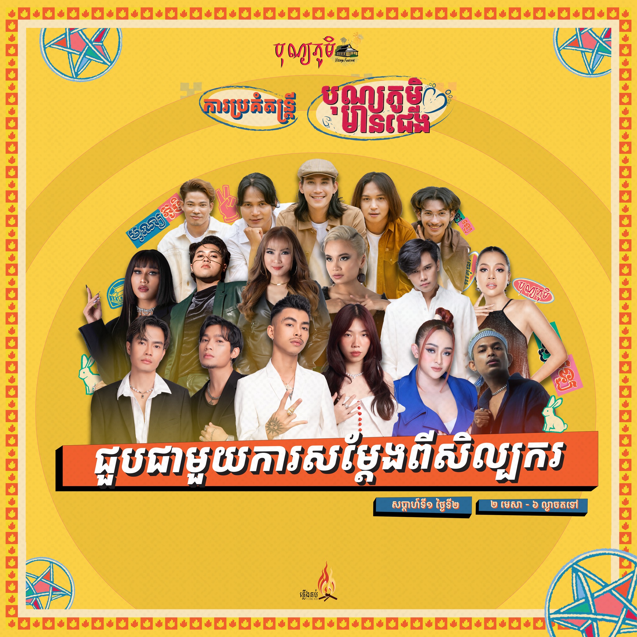 ក្នុងការប្រកាសរបស់គណៈកម្មការរៀបចំបានបញ្ចេញឈ្មោះសិល្បករទាំងអស់ចូលរួមសម្ដែង «ការប្រគំតន្ត្រីសប្បុរសធម៌ បុណ្យភូមិមានជើង»។ ក្នុងការផុសនោះទៀតសោតបានរៀបរាប់ថា “ថ្ងៃទី២មេសាអីយ៉ាស ចេញសិល្បករសប្ដាហ៍ទី១ ថ្ងៃទី២ នេះមកបើអត់ទិញសំបុត្រចូលរួមដូចមិនសម រីករាយជាមួយនឹងការសម្តែងសិល្បៈជាច្រើនពីសំណាក់សិល្បករដូចជា វណ្ណដា កញ្ញា សុភ័ក្ត្រ កុសុម៉ា ពិធីការិនីពោរពេញដោយវោហារស័ព្ទ, KAI – សិល្បករ និងក្រុមតន្ដ្រីអាយដលរបស់នារីៗ កញ្ញា កេសរ,ចំរើន សុភា និងសិល្បការនីរបាំប្រពៃណី, ក្រុម Polarix , Sophia Kao , SAI, វណ្ណថាន , ស៊ូ ស៊ីរីកា, ឆាឆា និង ម៉ាណុត”។