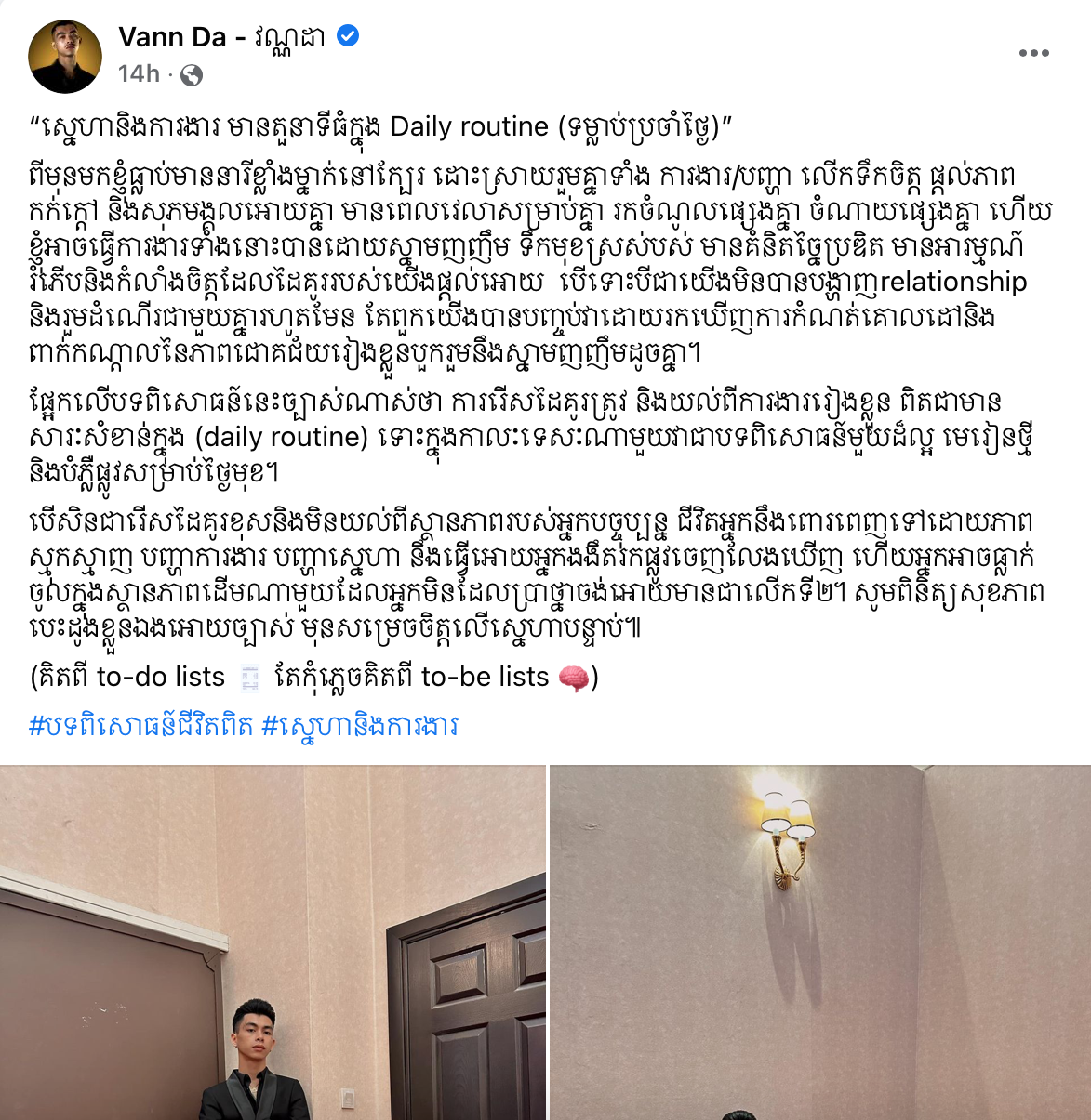 អ្នក​គាំទ្រ វណ្ណដា កម្របានឃើញរឿងបែបនេះណាស់ ដោយសុខៗ​តារាចម្រៀងរ៉េប វណ្ណដា បង្ហោះរឿងរ៉ាវស្នេហាលើបណ្តាញសង្គមហ្វេសប៊ុក ធ្វើឱ្យអ្នកគាំទ្រភ្ញាក់ផ្អើល​ខ្លាំង ជាមួយពាក្យពេចន៍ដែលលោកបានរៀបរាប់ ព្រោះវាជា​គំនិតពាក់ព័ន្ធរឿងរ៉ាវសម្ពន្ធភាព​រវាង​មនុស្ស​ពីរ​នាក់​​​ និងការងារ ហើយក៏មានភ្ជាប់ជាមួយបទពិសោធន៍ស្នេហ៍ចាស់របស់លោកថែមទៀតផង។