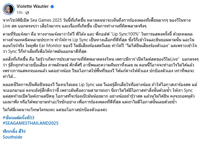 នៅក្នុងសំណេរដែលបង្ហោះនៅលើ Facebook តារាស្រី Violette Wautier បានរៀបរាប់ថា៖ “ទាក់ទងនឹងការសម្ដែងក្នុងពិធីបើកស៊ីហ្គេម ២០២៥ ដែលកើតឡើងនៅថ្ងៃនេះ មនុស្សជាច្រើនប្រហែលជាបានឃើញពីការច្រៀងខុសបច្ចេកទេសខ្លាំងរបស់ Vee ក្នុងពេលផ្សាយផ្ទាល់ហើយ។ សូមនិយាយត្រង់ៗថា ខ្ញុំពិតជាសោកស្ដាយយ៉ាងខ្លាំង ហើយហេតុការណ៍នេះគឺជាកំហុសឆ្គងដ៏ពិតប្រាកដមួយ”។
