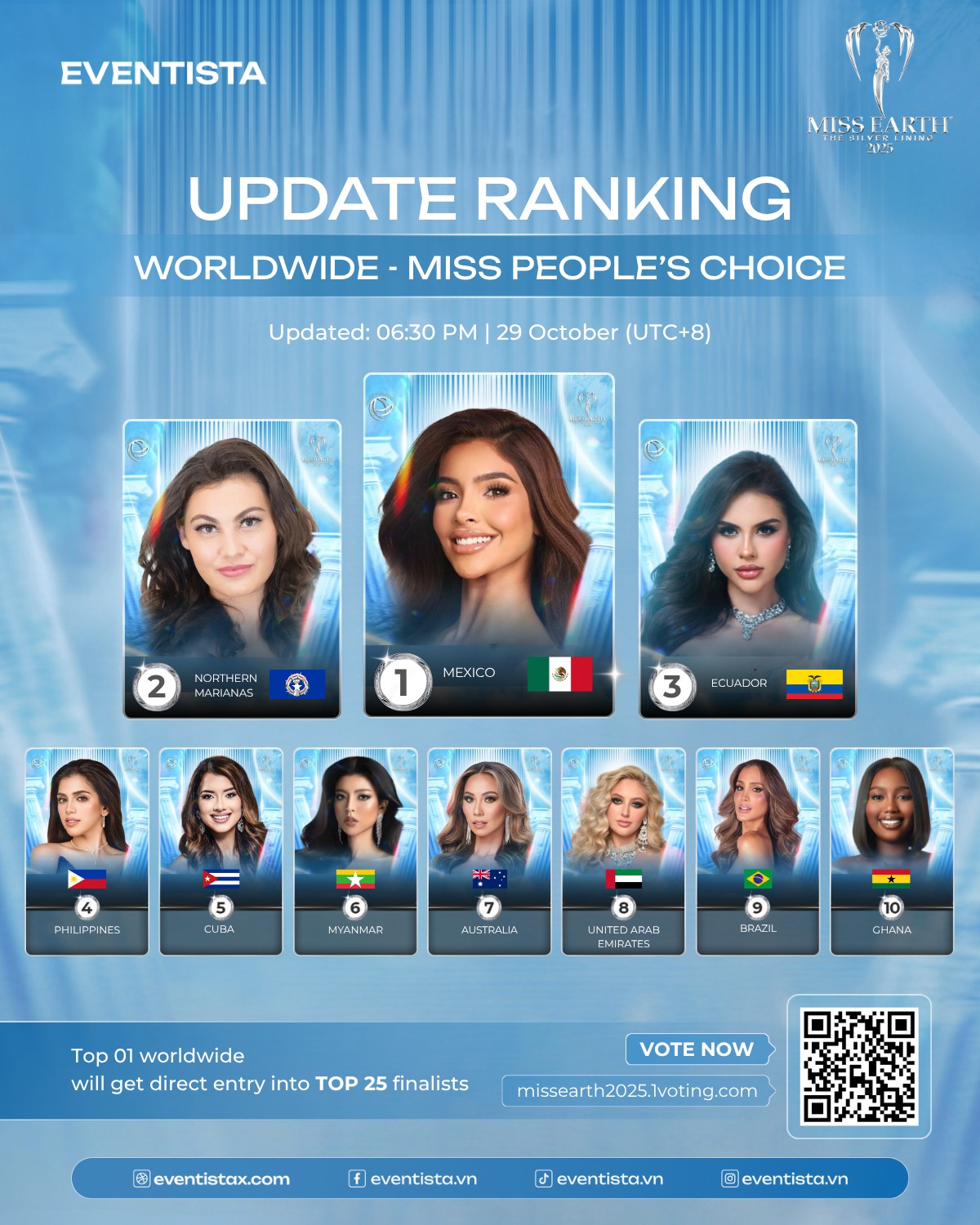 នៅមិនដល់ ១ សប្ដាហ៍ទៀតទេ ការបោះឆ្នោតជ្រើសរើសបវរកញ្ញារបស់មហាជន Miss People Choice នឹងត្រូវបានបញ្ចប់។ ដោយឡែក លទ្ធផលដែលប្រកាសដោយ Eventista កាលពីថ្ងៃទី ២៨ ខែ តុលា ក្នុងចំណោមថប់ទាំង ១០ គឺពុំទាន់មានកម្ពុជានោះឡើយ។ តាមការឱ្យដឹងបន្ថែមលើផេក Eventista រាល់បេក្ខភាពបវរកញ្ញាដែលទទួលបានសំឡេងបោះឆ្នោតគាំទ្រច្រើនជាងគេនឹងទទួលបានតំណែងជាបវរកញ្ញារបស់មហាជន ឬ Miss People Choice Award ហើយកាន់តែពិសេសទៀតនោះម្ចាស់ជយលាភីរូបនេះនឹងទទួលបានសិទ្ធពិសេសក្នុងការឡើងទៅកាន់ Top 25 ឬ ២៥ នាក់ចុងក្រោយនៃការប្រកួត Miss Earth 2025 ។