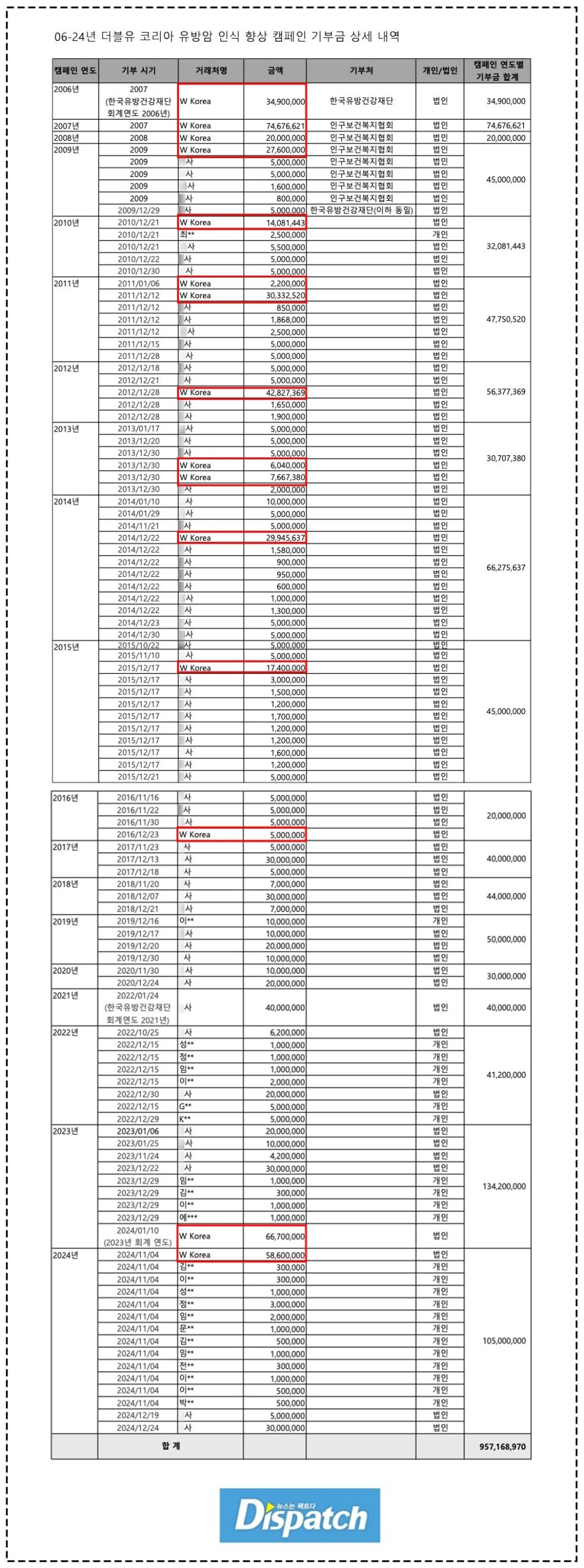 បន្ទាប់ពីមានការរិះគន់ចំពោះពិធីជប់លៀងកាលពីថ្ងៃទី 15 ខែតុលា W Korea បានអះអាងថា ខ្លួនបានបរិច្ចាគប្រាក់សរុបចំនួន 1.1 ពាន់លានវ៉ុន (ប្រហែល 774,000 ដុល្លារអាមេរិក) ក្នុងរយៈពេល 20 ឆ្នាំចុងក្រោយនេះ ដល់អង្គការនានាដែលធ្វើការពាក់ព័ន្ធជំងឺមហារីកសុដន់។ ខណៈដែលមហាជនបានរិះគន់ថាតួលេខហាក់ទាបរួចទៅហើយ បើប្រៀបធៀបទៅនឹងទំហំ និងភាពប្រណិតរបស់ព្រឹត្តិការណ៍កាលពីពេលថ្មីៗនោះ ប៉ុន្តែចុងក្រោយក៏មានលេចធ្លាយរបាយការណ៍ថ្មីទៀតបង្ហាញថា សូម្បីតែតួលេខបរិច្ចាគនេះក៏មានការបន្លំ និងប្រឌិតមួយផ្នែកដែរ។