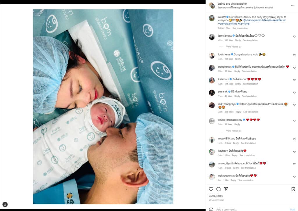 តាមរយៈការបង្ហោះលើគណនី Instagram ប្រមាណមួយម៉ោងមុននេះ តារាសម្ដែងដែលទើបក្លាយជាលោកប៉ានៅវ័យ ៣៧ឆ្នាំរូបនេះបានរៀបរាប់ថា “Our Kanaros family and baby Wylyn(วีลิน) say hi to everyone😉🫶🏻😍🎉” មានន័យថា “គ្រួសារ និងកូន Wylyn សូមជម្រាបសួរអ្នកទាំងអស់គ្នា”។