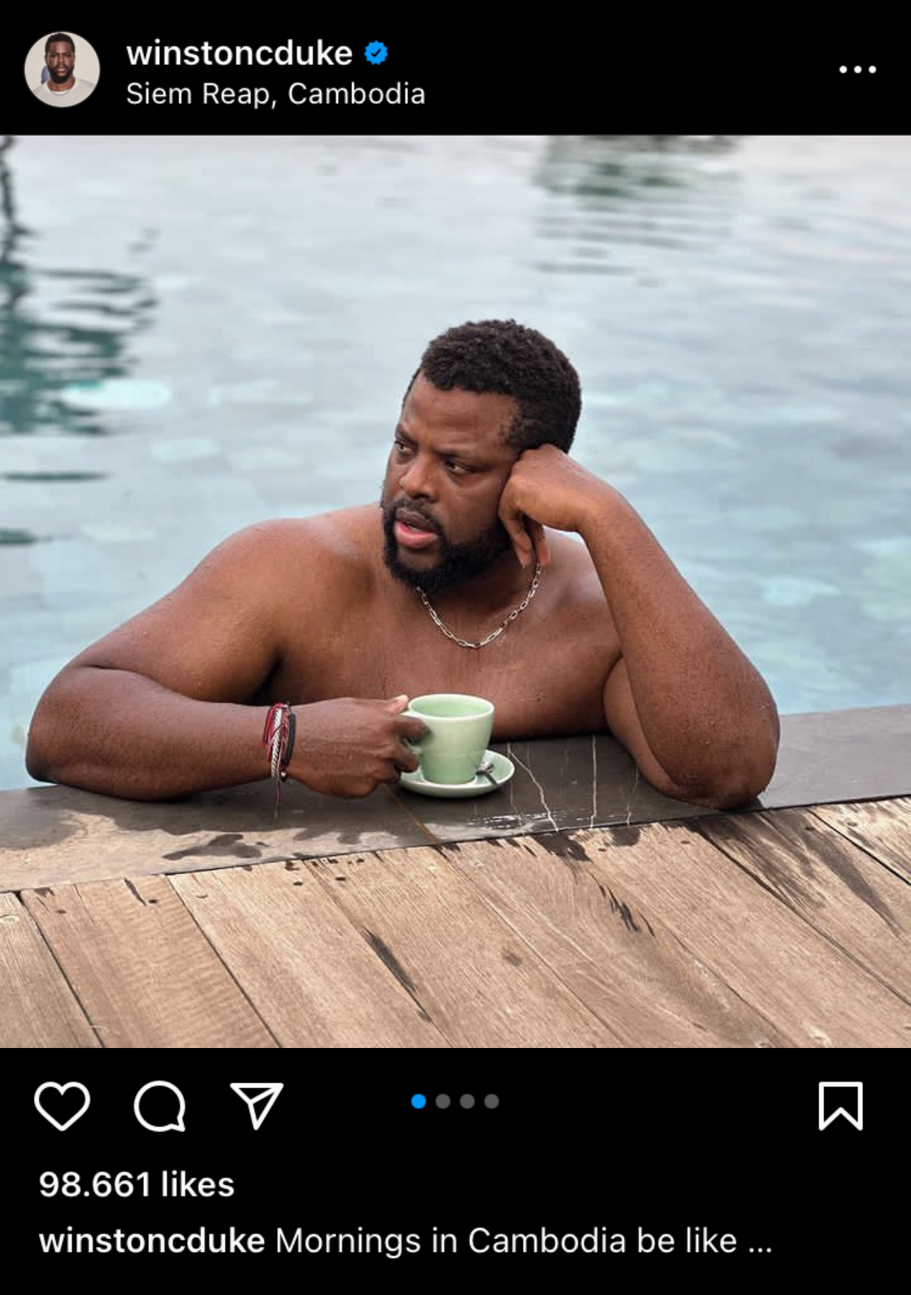 លោក Winston Duke ដែលអ្នកគាំទ្រស្គាល់ថា M’baku ក្នុងភាពយន្ត Black Panther និង Wakanda Forever បានបង្ហោះរូបភាព និងវីដេអូ នៅក្នុងរីសត មួយក្នុងខេត្តសៀមរាប ដោយភ្ជាប់ជាមួយនឹង Caption ថា «ពេលព្រឹកនៅ ប្រទេសកម្ពុជាគឺដូច្នេះ…»។