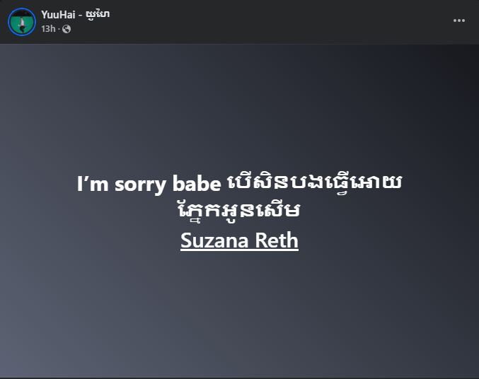 ក្រោយទម្លាក់បទចម្រៀងថ្មី «ស៊ីជម្ពូ» កាលពីម្សិលមិញ យូហៃ បានទម្លាក់ Status ដ៏សែនខ្យូតនៅលើអាខោនផ្ទាល់ខ្លួនរបស់លោកហើយថែមទាំង Tag ស្រីស្អាត រ៉េត ស៊ូហ្សាណា ទៀតផង។ Status ដែលធ្វើឱ្យបណ្ដាអ្នកគាំទ្រ ព្រមទាំង Shipper របស់អ្នកទាំងពីរ ជ្រួលជ្រើមទាំងយប់ត្រូវបានសរសេរបែបនេះថា «I’m sorry babe បើសិនបងធ្វើអោយភ្នែកអូនសើម»។