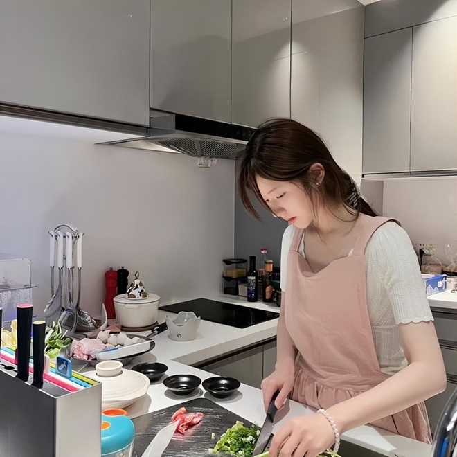 បន្ទប់ផ្ទះបាយជាមួយនឹងពណ៌ប្រផេះ ពណ៌ស និងពណ៌ត្នោត និងការរចនាផ្ទៃខាងក្នុងបែបតិចតួចបំផុតបានបង្កើតអារម្មណ៍ដ៏ប្រណីត ដូច្នេះមិនចម្លែកនោះទេដែល Zhao Lusi ចែករំលែកថា នាងតែងចំណាយពេលច្រើនធ្វើម្ហូប។