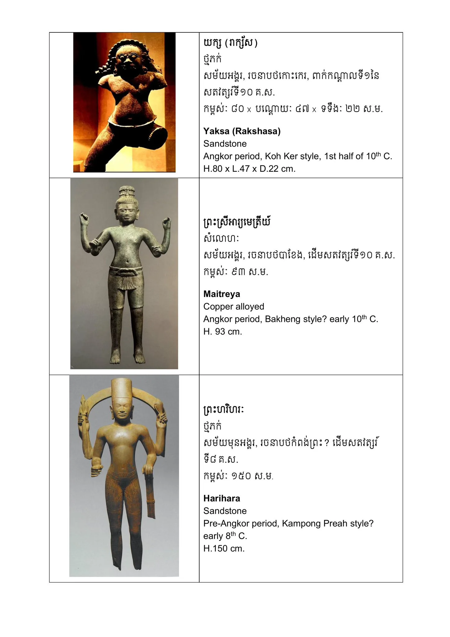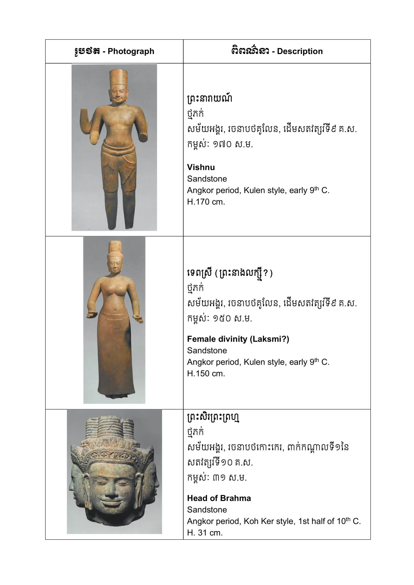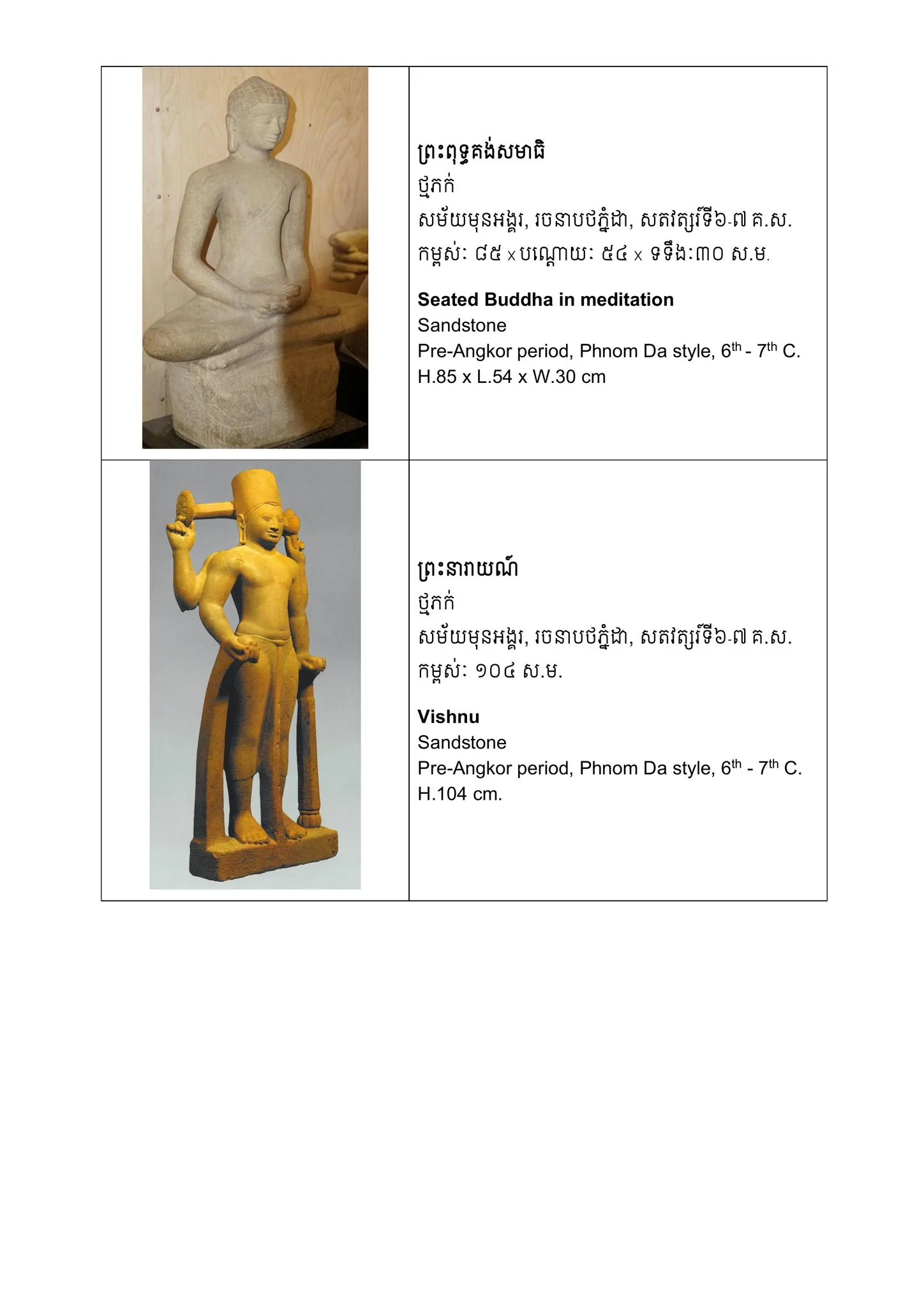 វត្ថុសិល្បៈទាំងនោះមានអាយុកាលតាំងពីសម័យមុនអង្គរ រហូតដល់សម័យរុងរឿងនៃចក្រភពអង្គរ មានជាអាទ៍ បដិមាដ៏ល្អឯកសាងពីថ្មភក់ និងលោហធាតុ ព្រមទាំងវត្ថុប្រើប្រាស់ក្នុងកិច្ចពិធីផ្សេងៗ។ ក្នុងចំណោមវត្ថុសំខាន់ទាំងនោះមាន បដិមាដ៏ពិចិត្រចំនួន២ សាងពីថ្មភក់នាដើមសម័យអង្គរ ស្ថិតក្នុងរវាង ៥០ឆ្នាំដំបូងនៃសតវត្សទី៩ ក្នុងរាជ្យព្រះបាទជ័យវរ្ម័នទី២ , បដិមាទេពប្រុសនិងទេពស្រីមួយគូ , ព្រះសិរ្សព្រះព្រហ្ម សាងពីថ្មភក់ និងបដិមាយក្ស (រាក្ស័ស) មកពីតំបន់កោះកេរ្ត៍ , ព្រះសិរ្សព្រះព្រហ្មដែលមានទម្រង់ព្រះភក្ត្រស្ងប់និងពោរពេញដោយអំណាច , វត្ថុពិចិត្រមួយទៀតនោះគឺបដិមាសំរឹទ្ធរចនាបថបាខែង ដែលជាស្នាដៃឯកបង្ហាញពីការវិវត្តផ្នែកមដិមាសាស្ត្រនាដើមសម័យអង្គរ។ គួរឱ្យដឹងថា វត្ថុបុរាណទាំង ៧៤ នេះពុំមែនគ្រាន់តែជាស្នាដៃ តែជាសាក្សីរស់នៃបញ្ញាញាណ និងទេពកោសល្យរបស់បុព្វបុរស និងដួងព្រលឹងនៃអារ្យធម៌ខ្មែរ៕