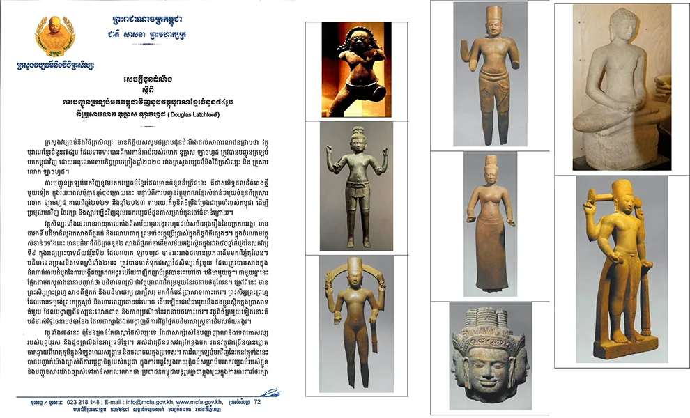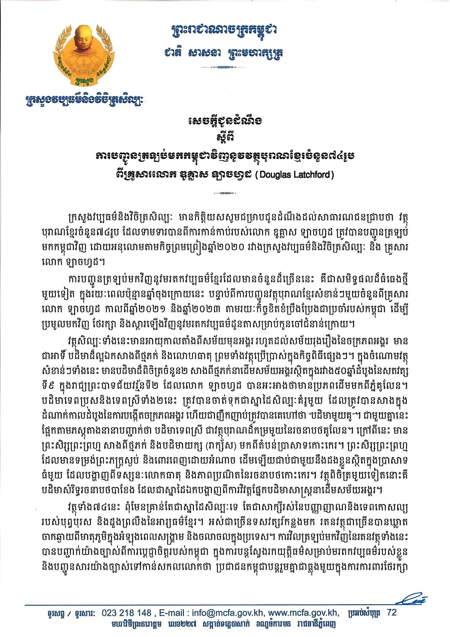 មុននេះបន្តិច ក្រសួងវប្បធម៌ និងវិចិត្រសិល្បៈបានប្រកាសស្វាគមន៍ការវិលត្រឡប់មកកាន់មាតុភូមិកំណើតនៃវត្ថុបុរាណខ្មែរចំនួន ៧៤ រូប ដែលទាមទារបានពីការកាន់កាប់របស់លោក ឌូគ្លាស ឡាចហ្វដ មកកាន់ប្រទេសកម្ពុជា។