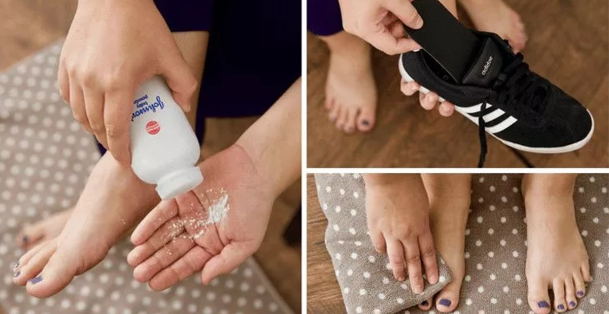 បើមិនចង់ចំណាយពេលយូរ អ្នកទាំងអស់គ្នាក៏អាចប្រើម្សៅកូនក្មេងដើម្បីបំបាត់បានដែរ។ សម្រាប់វិធីប្រើវិញគ្រាន់តែចាក់ម្សៅចូលក្នុងស្បែកជើងក្នុងចំនួនតិចល្មមមុនពេលពាក់ជាការស្រេច។ ធ្វើបែបនេះវាមិនត្រឹមតែជួយទប់ញើសទេ វាថែមទាំងអាចទប់ក្លិនមួយកម្រិតដែរ។