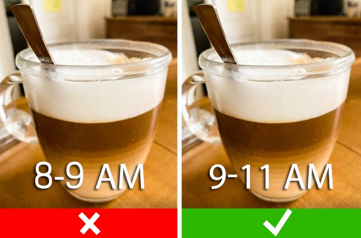 នៅ​ចន្លោះ​ម៉ោង ៨ ដល់ ៩​ព្រឹក​រាង​កាយ​របស់​មនុស្ស​បញ្ចេញ​អ័រម៉ូន cortisol ដែល​ធ្វើ​ឲ្យ​មនុស្ស​មាន​អារម្មណ៍​ស្វាង​ស្រាប់​ទៅ​ហើយ​ដោយ​មិន​ចាំ​បាច់​ប្រើ​កាហ្វេ​ ឬ​ភេសជ្ជៈ​ផ្សេង​មក​ជំរុញ​ទេ។ បើ​អ្នក​ផឹក​កាហ្វេ​ចន្លោះ​ម៉ោង​នេះ​ក៏​មិន​ប៉ះពាល់​អ្វី​ដល់​សុខភាព​ឡើយ​គ្រាន់​តែ​ខ្ជះខ្ជាយ​សារជាតិ​កាហ្វេ​ប៉ុណ្ណោះ​។ ពេល​វេលា​ដ៏​ល្អ​បំផុត​ក្នុង​ការ​ទទួល​ទាន​កាហ្វេ​គឺ​ម៉ោង​ ៩កន្លះ​ព្រឹក​ដល់​ ១១​ព្រឹក និង​ម៉ោង​១ រសៀល ដល់​ម៉ោង ៥​ល្ងាច។