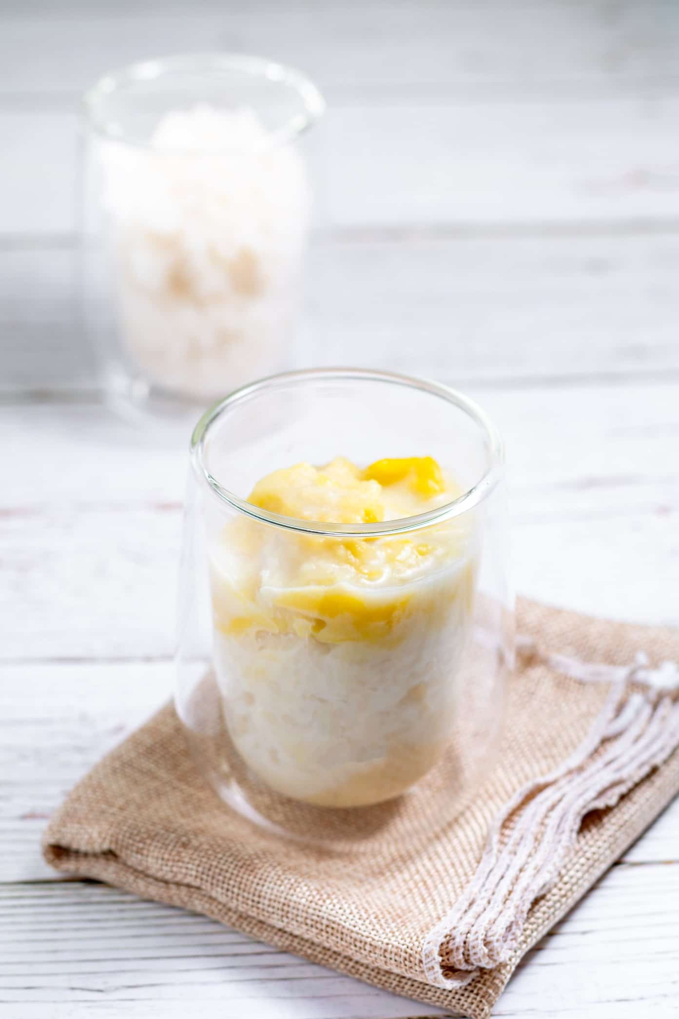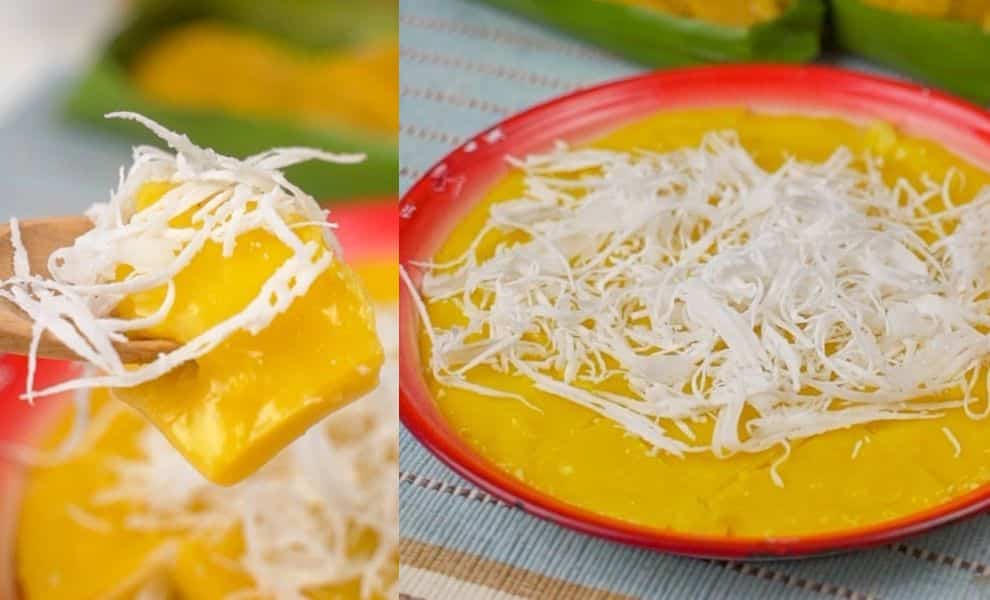 ២. បន្ទាប់មកចាប់ផ្ដើមរម្ងាស់ខ្ទិះដូង ដោយចាក់ខ្ទិះដូងមួយកូនចានកន្លះចូលទៅក្នុងឆ្នាំងតូចល្មម ដាក់ស្ករស ១ ស្លាបព្រាបាយ រួចកូរវាឲ្យរលាយ ហើយដាក់អំបិលបន្ដិច។ បន្ទាប់ពីពុះយកវាមកកូរលាយជាមួយបាយដំណើបដែលចំហុយឆ្អិនឲ្យសព្វរួចទុកមួយអន្លើ។