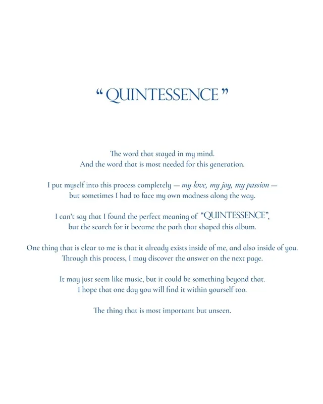 ដ្បិតមិនទាន់អាចបញ្ជាក់ពីអត្ថន័យនៃពាក្យថា “QUINTESSENCE” តែ Taeyang បានបង្ហើបថា ដំណើរស្វែងរកអត្ថន័យនៃពាក្យនេះហើយ ដែលបង្កើតឱ្យចេញនូវអាល់ប៊ុមថ្មីនេះ។ មុននឹងបញ្ចប់ រូបភាពនេះក៏បានបន្សល់នូវប្រយោគចុងក្រោយ បង្កើនចម្ងល់ដល់អ្នកគាំទ្រថា៖ “អ្វីដែលសំខាន់បំផុត តែមិនអាចមើលឃើញដោយភ្នែកទេ”។