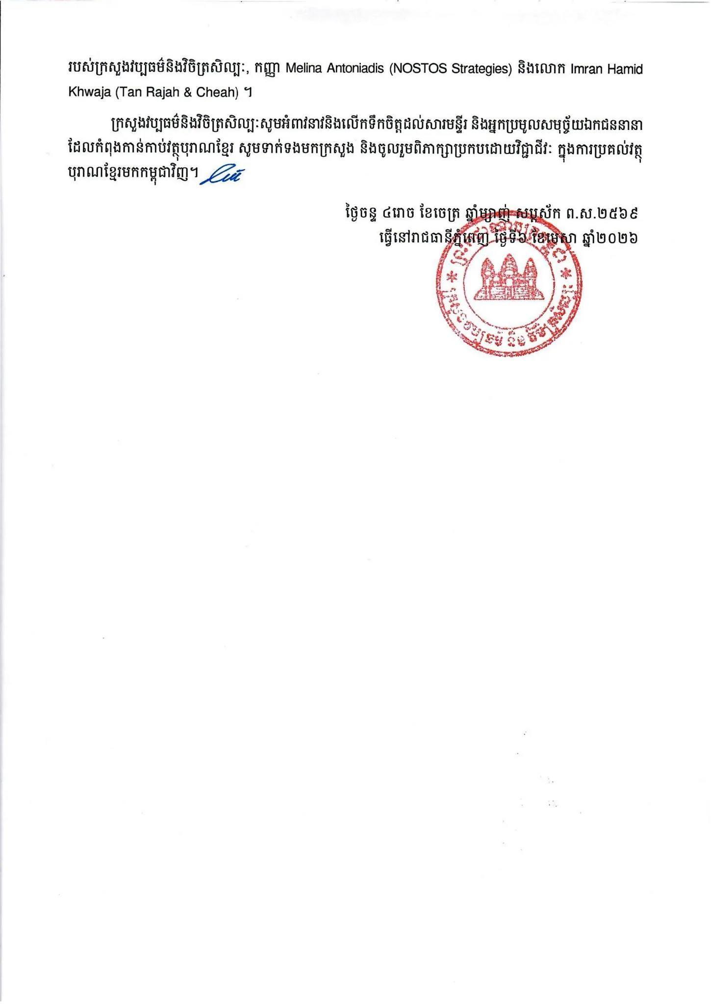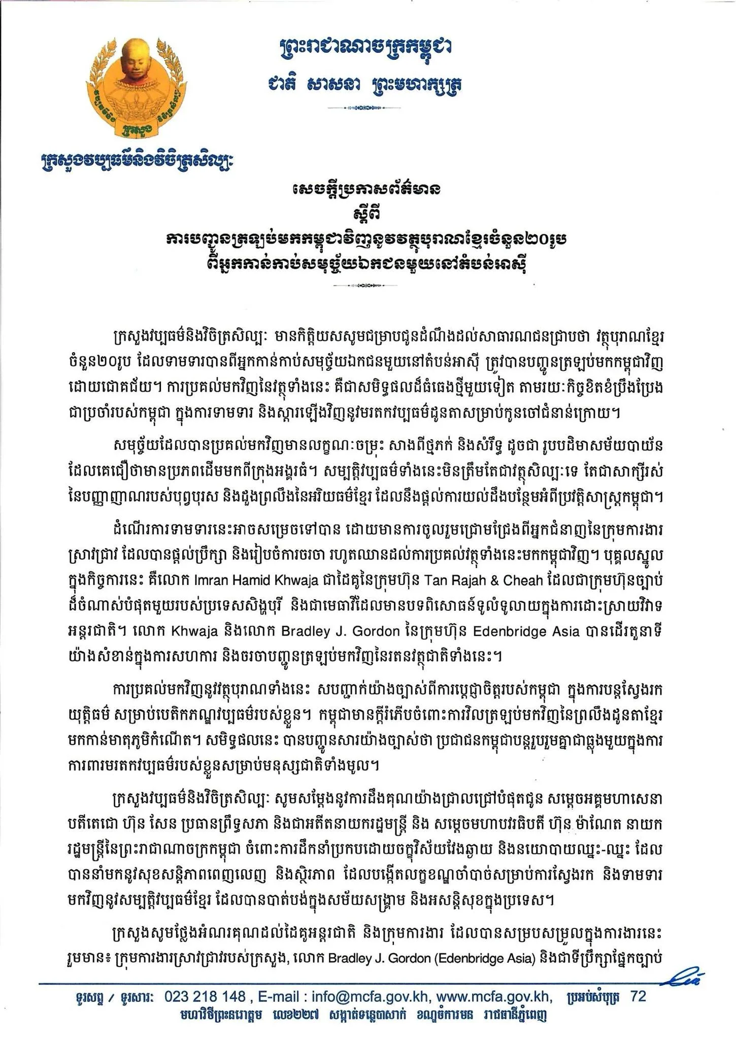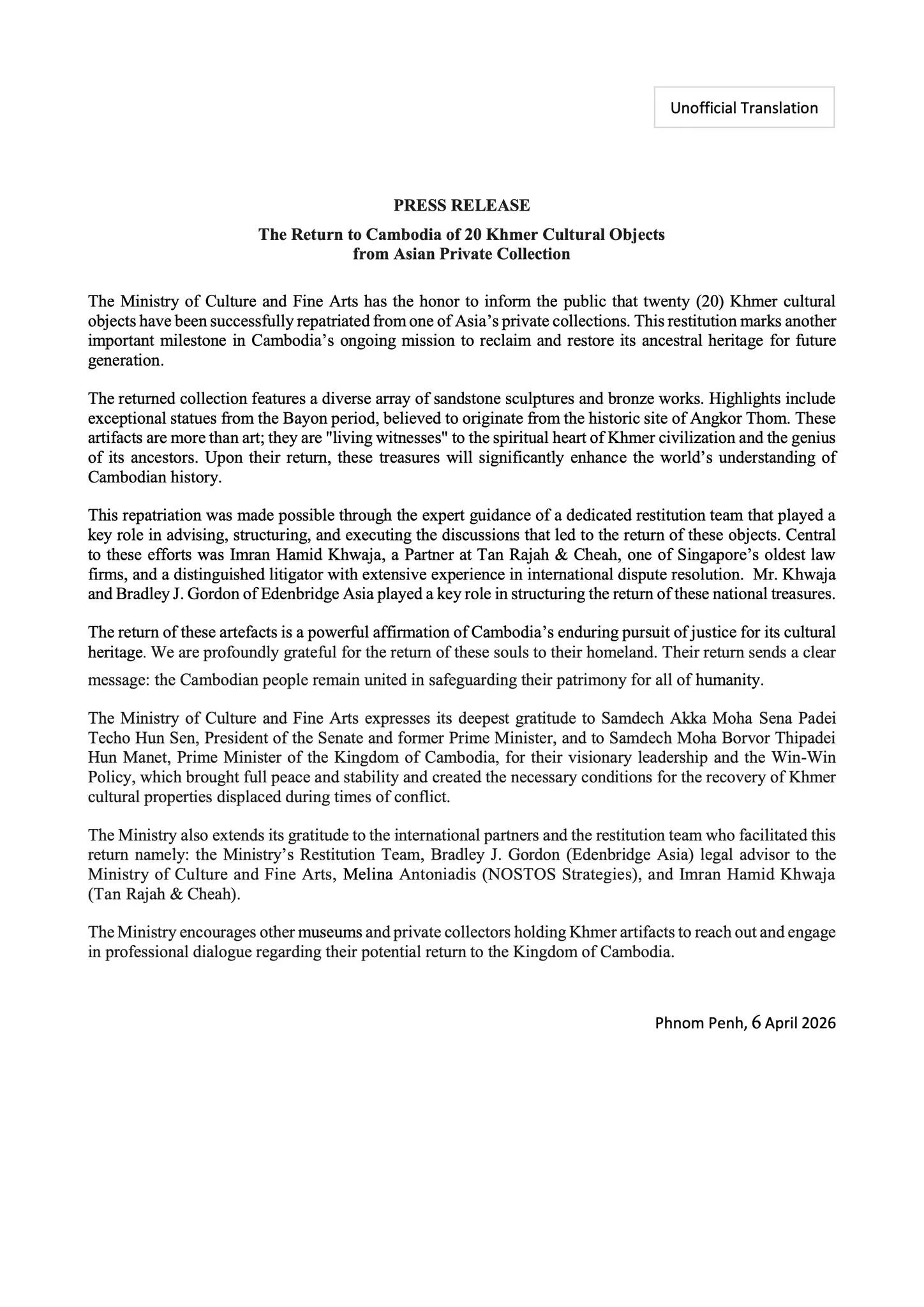 ជាមួយគ្នា ក្រសួងក៏បានអំពាវនាវនិងលើកទឹកចិត្តដល់សារមន្ទីរ និងអ្នកប្រមូលសមុច្ច័យឯកជននានាដែលកំពុងកាន់កាប់វត្ថុបុរាណខ្មែរ សូមទាក់ទងមកក្រសួង និងចូលរួមពិភាក្សាប្រកបដោយវិជ្ជាជីវៈ ក្នុងការប្រគល់វត្ថុបុរាណខ្មែរមកកាន់កម្ពុជាវិញ៕