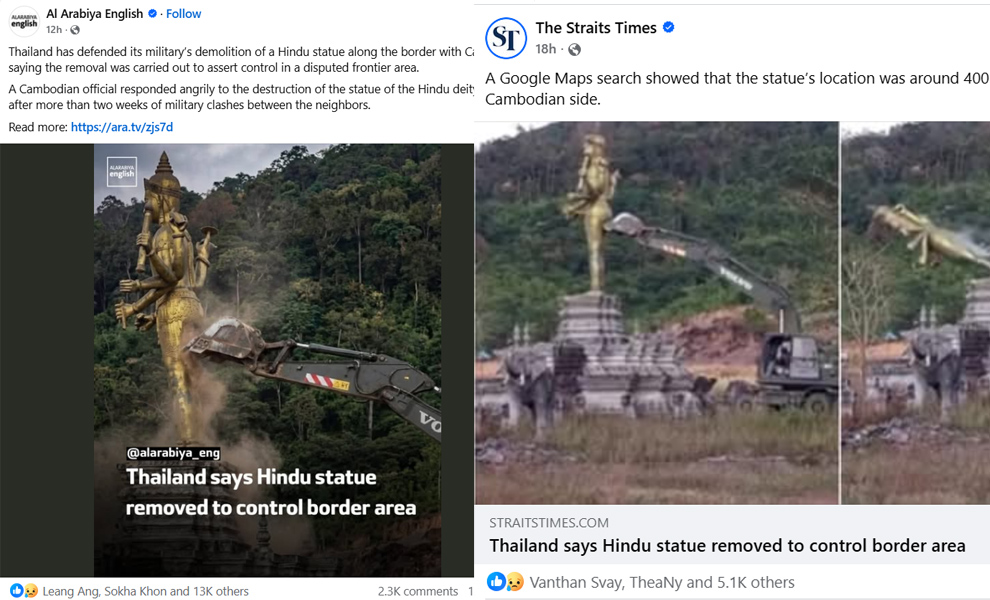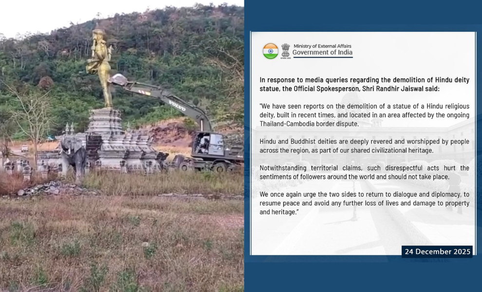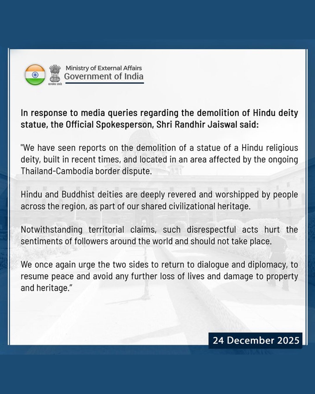 នៅក្នុងសេចក្ដីថ្លែងការណ៍ទាក់ទងនឹងបញ្ហានេះ អ្នកនាំពាក្យក្រសួងការបរទេស លោក Randhir Jaiswal បាននិយាយថា៖ “យើងទទួលបានការរាយការណ៍ស្ដីពីការកម្ទេចរូបសំណាកនៃហិណ្ឌូសាសនា ដែលជាសំណង់សាងសង់ថ្មី នៅក្នុងតំបន់ដែលរងផលប៉ះពាល់ដោយជម្លោះព្រំដែនថៃ-កម្ពុជា”។