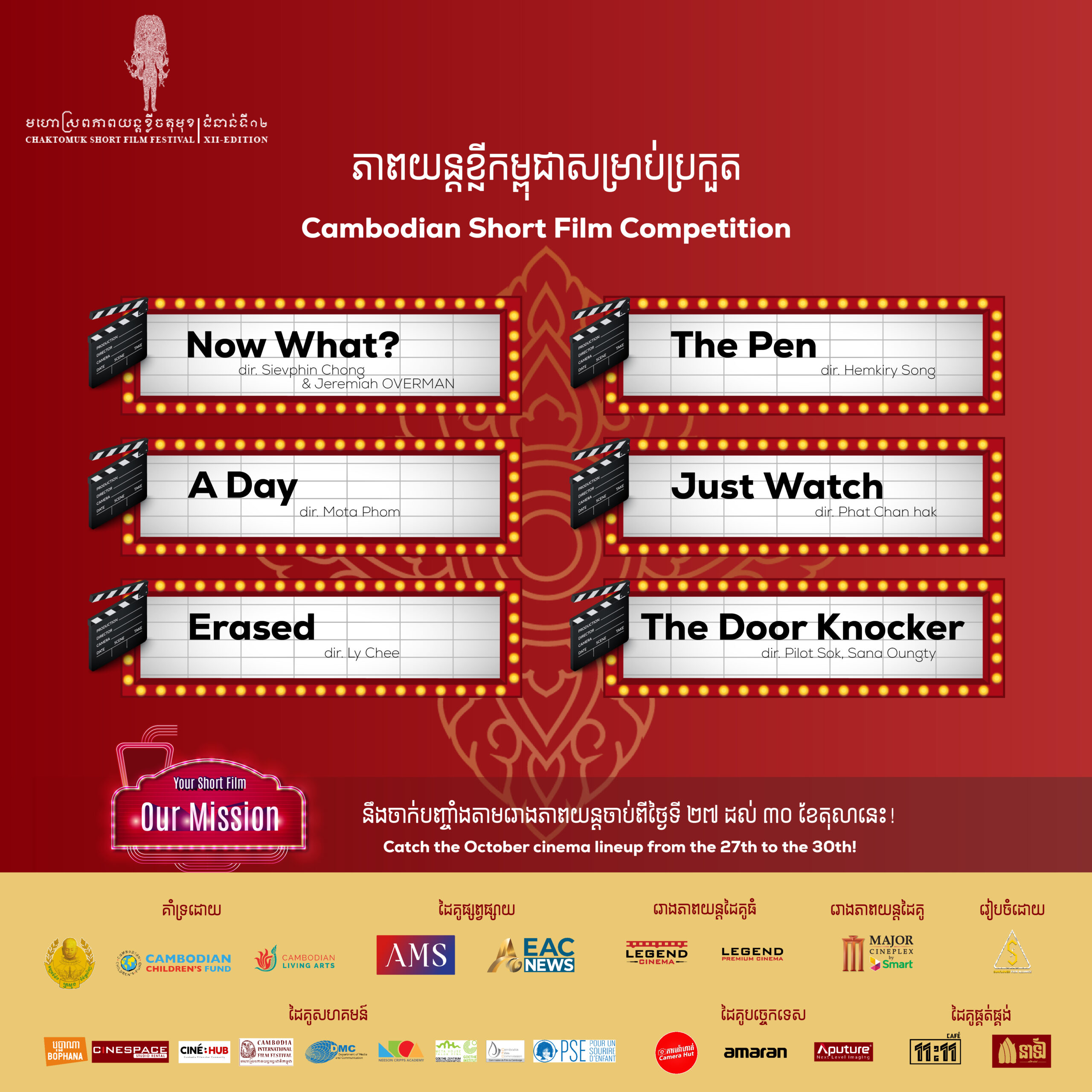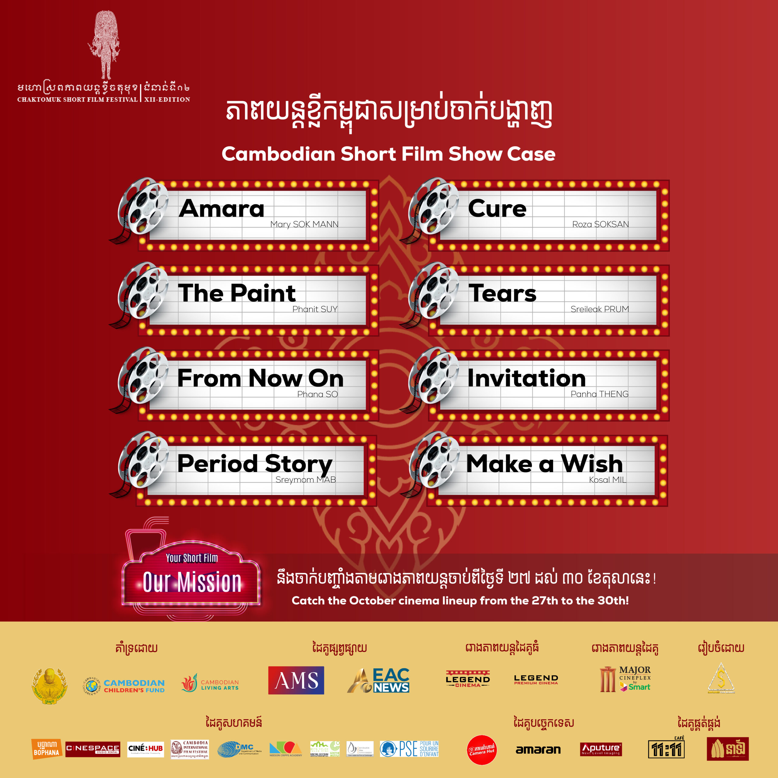 មហោស្រពភាពយន្តខ្លីចតុមុខរបស់យើង នឹងរៀបចំឡើងទៅ ពីថ្ងៃទី២៧ ដល់ទី៣០ ខែតុលាឆ្នាំនេះ រយៈពេលសរុបមានចំនួន ៤ថ្ងៃជាប់ៗគ្នា ដែលក្នុងនោះមានកម្មវិធីបើកនិងបិទមហោស្រពផងដែរ។ ទស្សនិកជនដែលចង់លើកទឹកចិត្តយុវសមិទ្ធករ និងចង់មានចូលចិត្តភាពយន្តខ្មែរក៏ដូចជាបរទេស អាចសាធារណៈជនអាចមកចូលរួមទស្សនារាល់រឿងខ្លីជាប់ជម្រើសទាំងអស់ នៅតាមរោង ភាពយន្ត ដូចជា Legend Cinema – Olympia Mall, K-Mall, SenSok Mega Mall, Major Cineplex – Sorya និង Cine Hub។