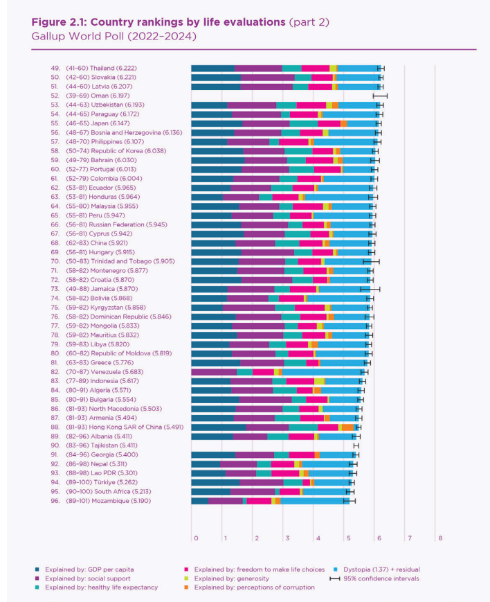 ប្រជាជននៅក្នុងប្រទេស និងដែនដីចំនួន ១៤៣ ត្រូវបានស្នើសុំឱ្យវាយតម្លៃជីវិតរបស់ពួកគេលើមាត្រដ្ឋានពីសូន្យដល់លេខ ១០ ដោយលេខ ១០ នោះគឺតំណាងឱ្យជីវិតល្អបំផុត។ លទ្ធផលជាមធ្យមសម្រាប់រយៈពេលបីឆ្នាំចុងក្រោយត្រូវបានប្រើប្រាស់ដើម្បីបង្កើតចំណាត់ថ្នាក់។